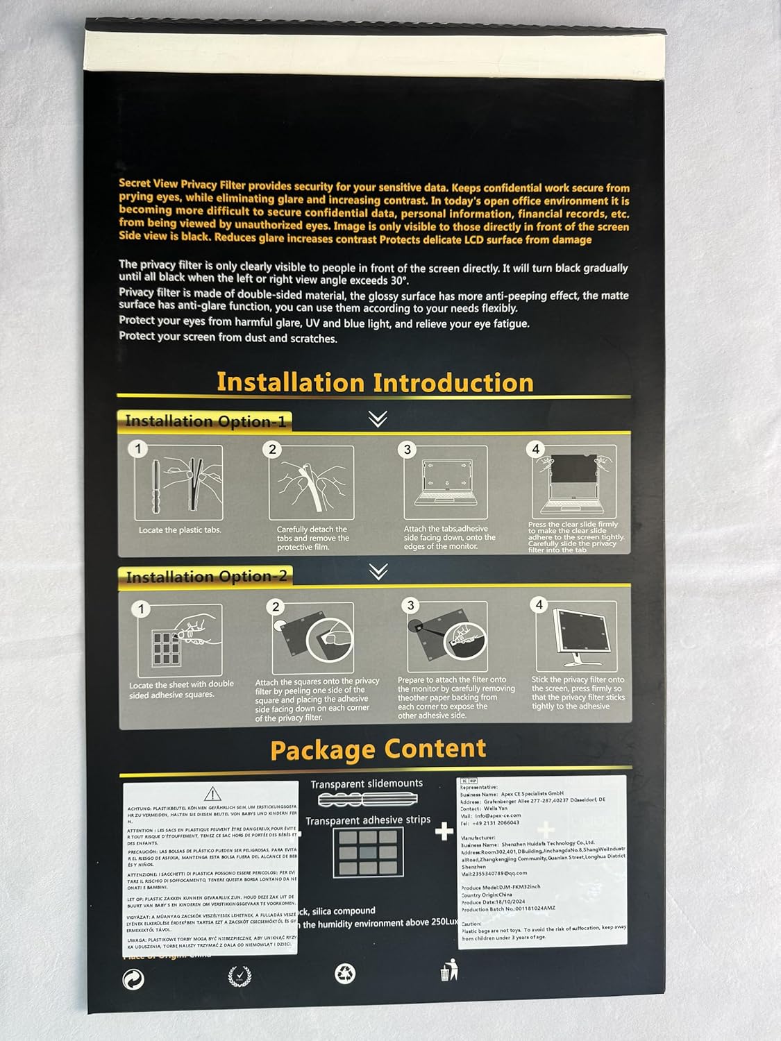 - 【Easy to Install & Reusable】Our 32 inch privacy screen for monitor has 2 uniquely designed installation methods: ① Permanent installation- double sided adhesive tape. Suitable for all computers with a screen aspect ratio of 16:9 and a size of 32 inches. ② Removable installation- slide mount tab. Suitable for computer with raised frame, you can slide the filter in and out of the screen as needed, it provide a quick and easy way to remove your monitor privacy filter when you don't need.