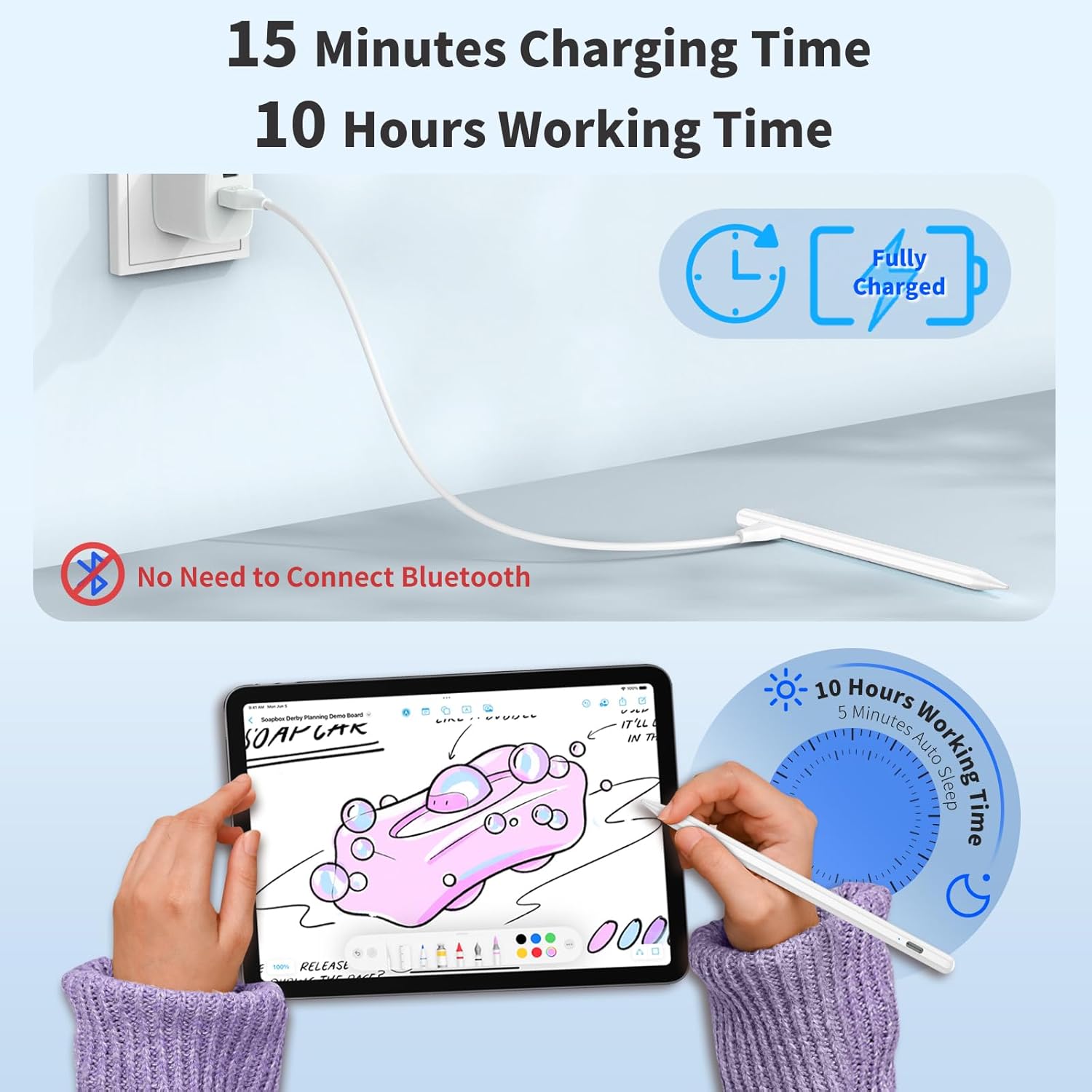 - ✅Fast Charging and Long Standby: This stylus pen support 10 hours of continuous use and 180 days long term standby for only 15 Minutes per charging. Don’t need to turn off it by hand, it will auto-fall asleep after idle for 5 minutes to save power