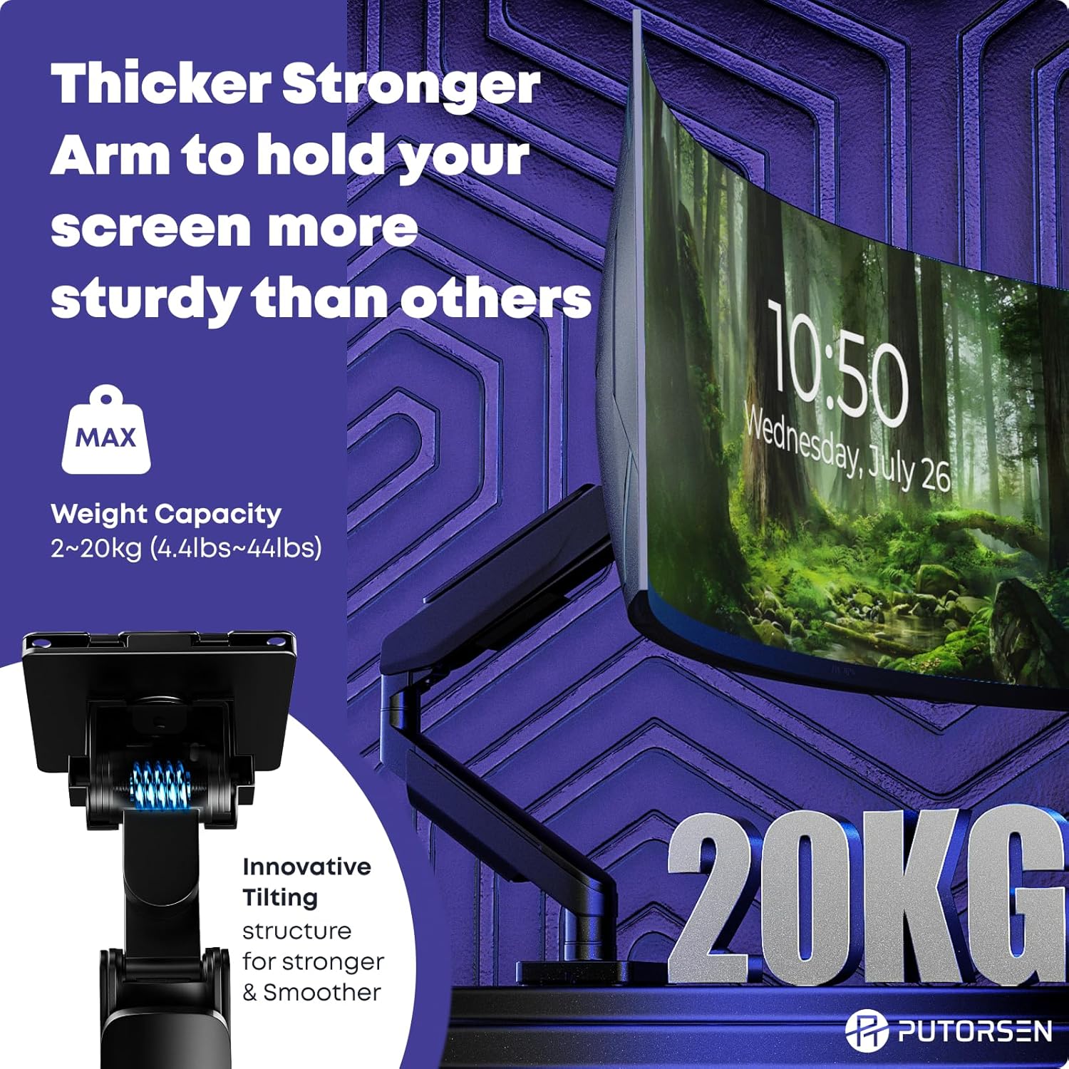 - For Ultra Wide Screens: PUTORSEN ultrawide monitor arm fits most 17 - 49 inch Flat Curved Screens including Samsung 49 inch Odyssey G9 and LG 49 inch UltraWide Dual QHD IPS Curved; It holds 4.4 lbs to 44 lbs in weight; It's suitable for VESA patterns 75 x 75 mm and 100 x 100 mm and compatible with different size screens, including but not limited to 49 47 45 43 42 40 38 35 32 30 28 27 25 24 23 22 21 20 19 17 inch screens; Achieved Patent: CN218095032U, CN307491498S, KR301193381S