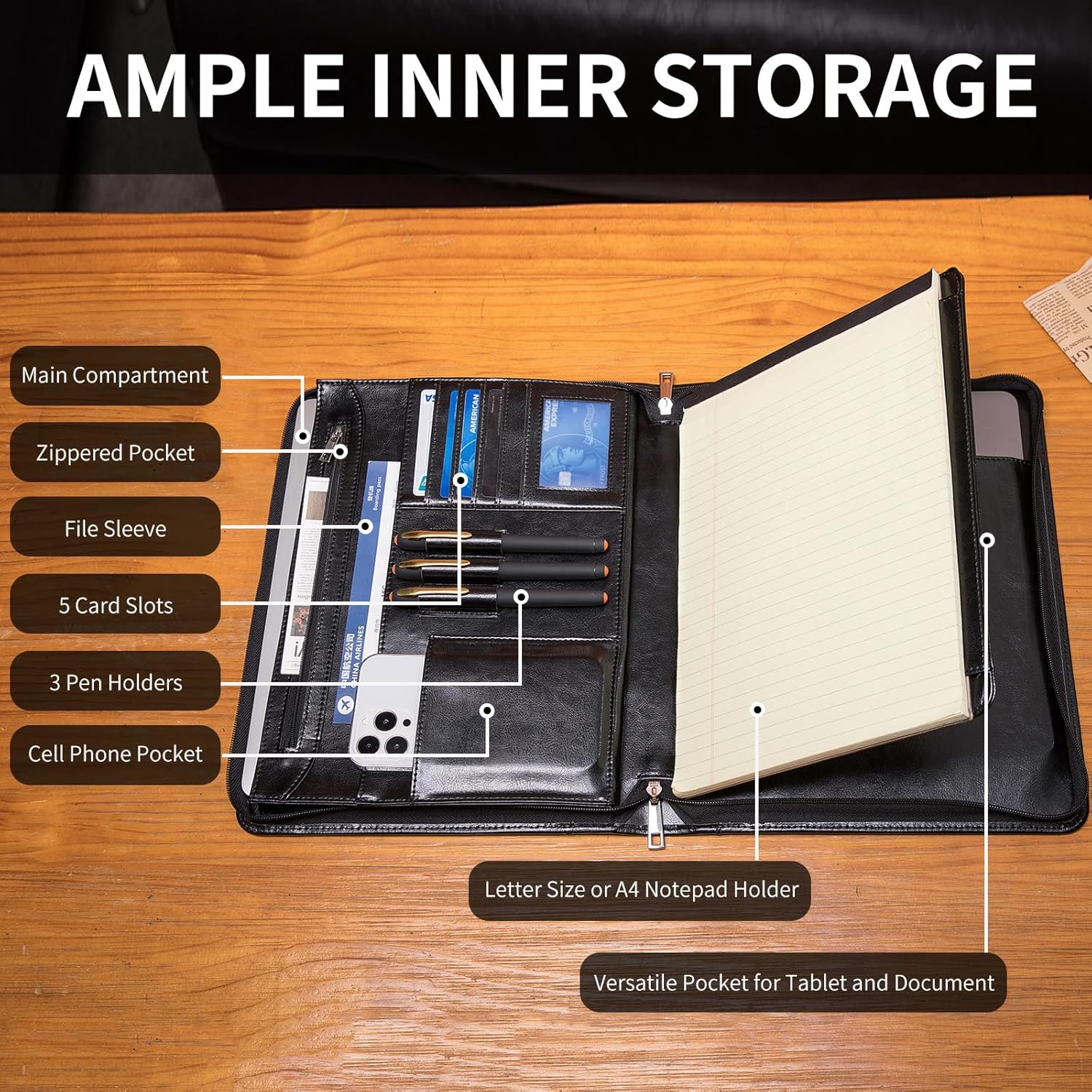 Vegan Leather Portfolio with Hidden Handle, Front Pocket, Business Padfolio Tablet/13” Laptop Organizer, Folio Document Cell Phone Holder, Professional Executive Folder, Black