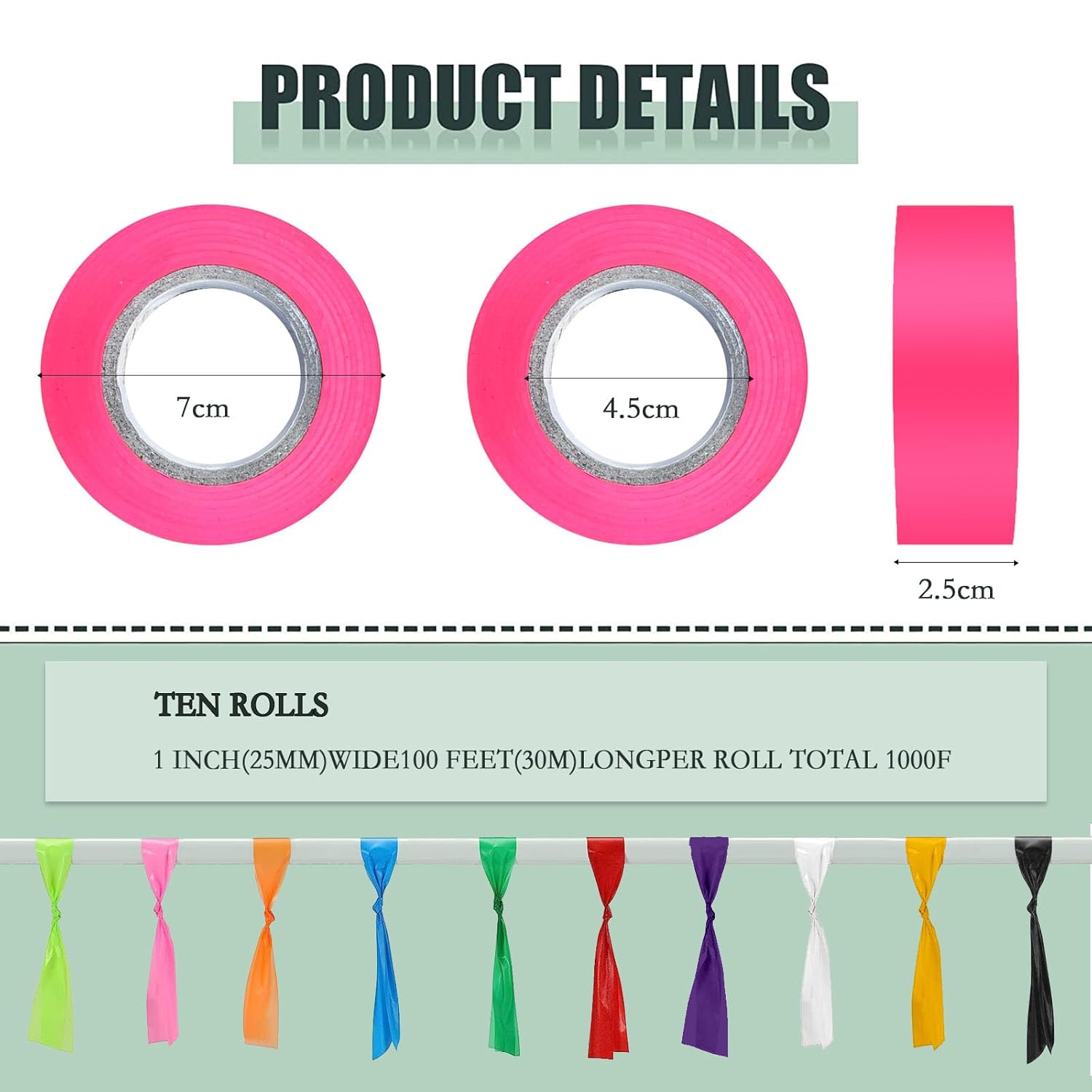 - Package includes: 10 PCS flagging tape assorted colors. Each marking tape roll is 1" width, 100' length, which is long and wide enough for a lot of applications. 10 color tapes can meet your requirements for almost every possible scenes.