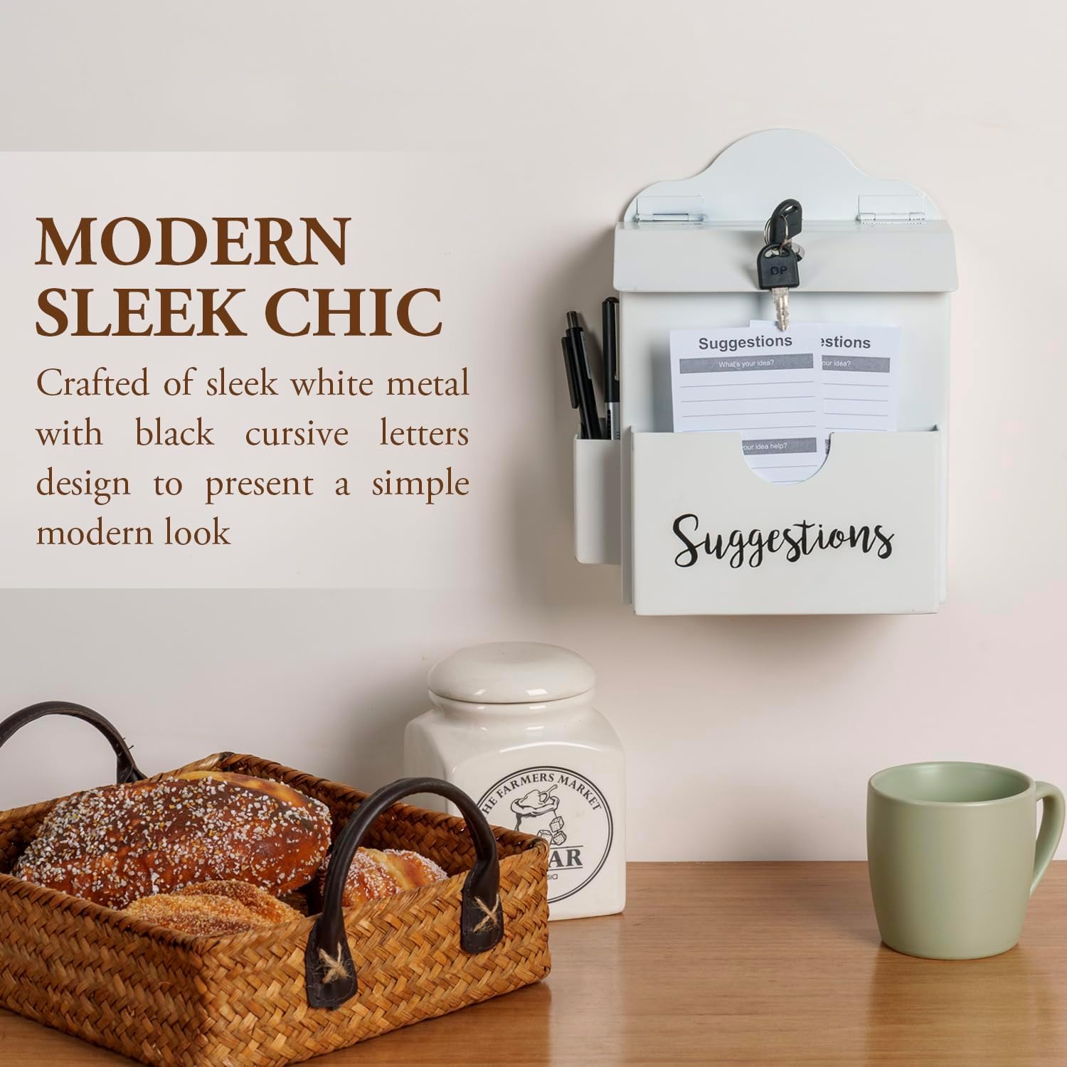 - Classic white metal multi-use suggestion box with printed black cursive "Suggestions", can be mounted on any wall or set of any tabletop **Includes drywall anchors and standard screws; Includes anti-slip bottom footpads**