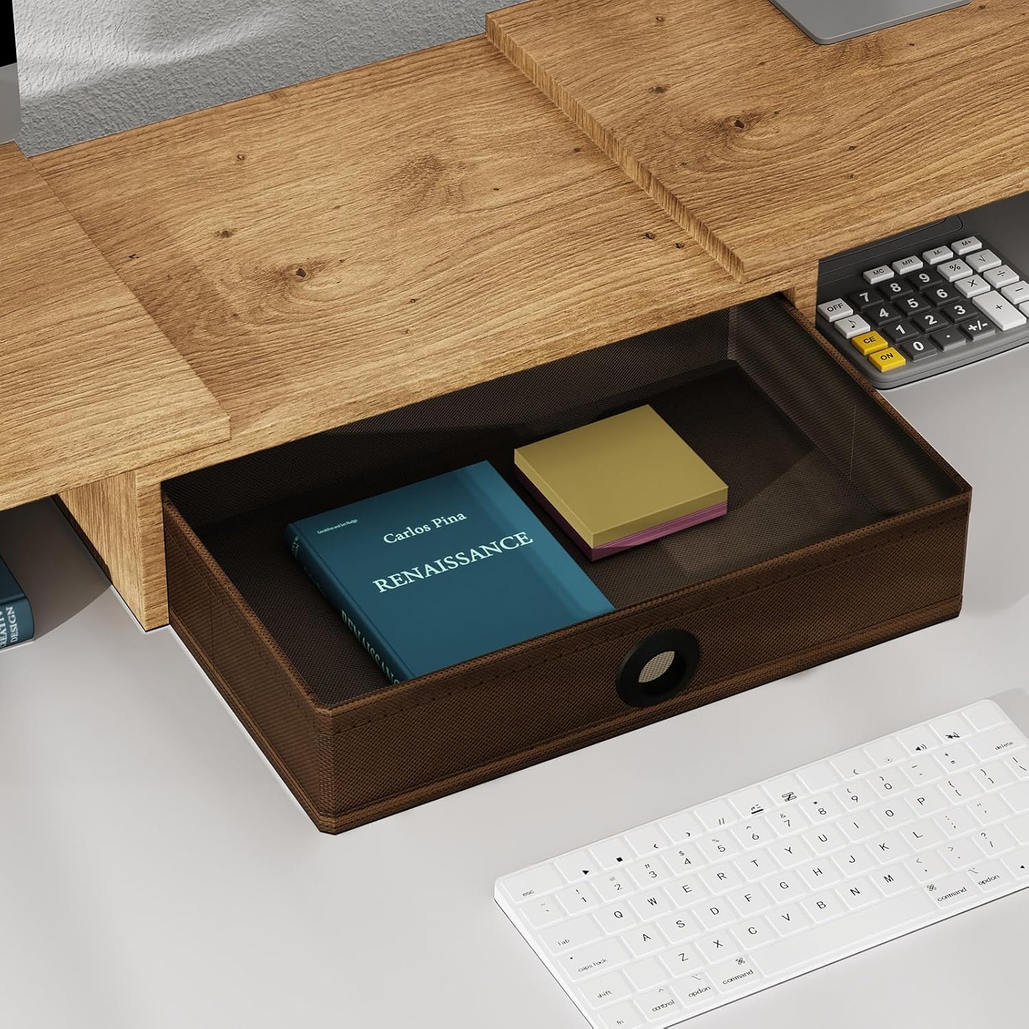 - Desktop Organizer with Drawer and Pen Slots: Our computer monitor stand comes with a drawer for storing sticky notes, writing utensils, files and notebooks. There are also two pen slots on both sides of the panel.