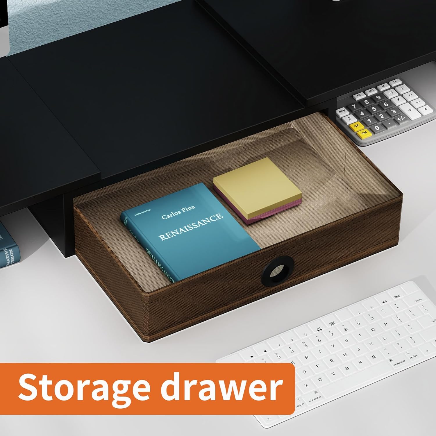 - Desktop Organizer with Drawer and Pen Slots: Our computer monitor stand comes with a drawer for storing sticky notes, writing utensils, files and notebooks. There are also two pen slots on both sides of the panel.