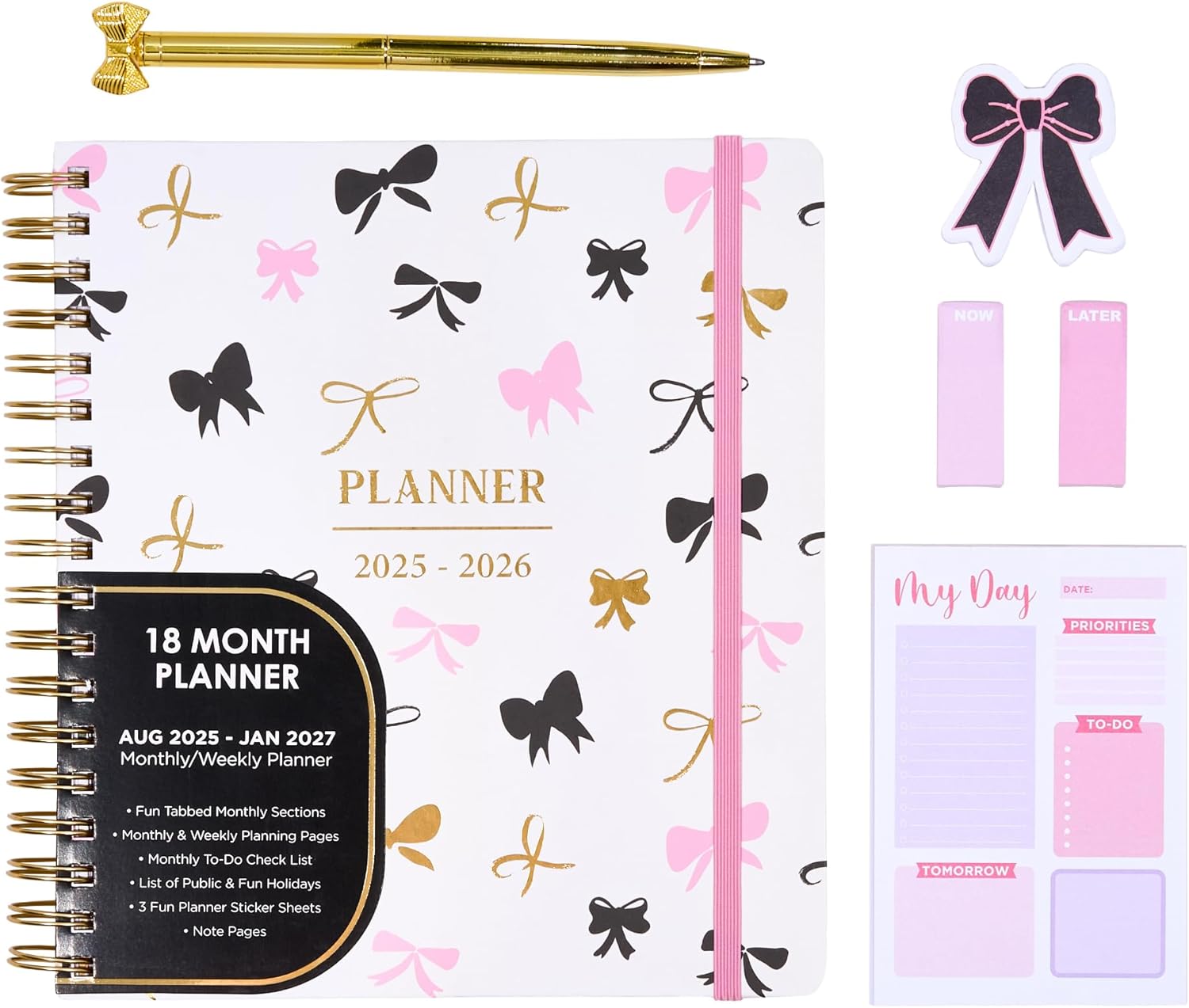 Votum August 2025 to January 2027 Large Back to School Academic Planner- Daily, Weekly & Monthly Organizer with Pens, Stickers, Sticky Notes, and a Sturdy Cover - Bows Pink