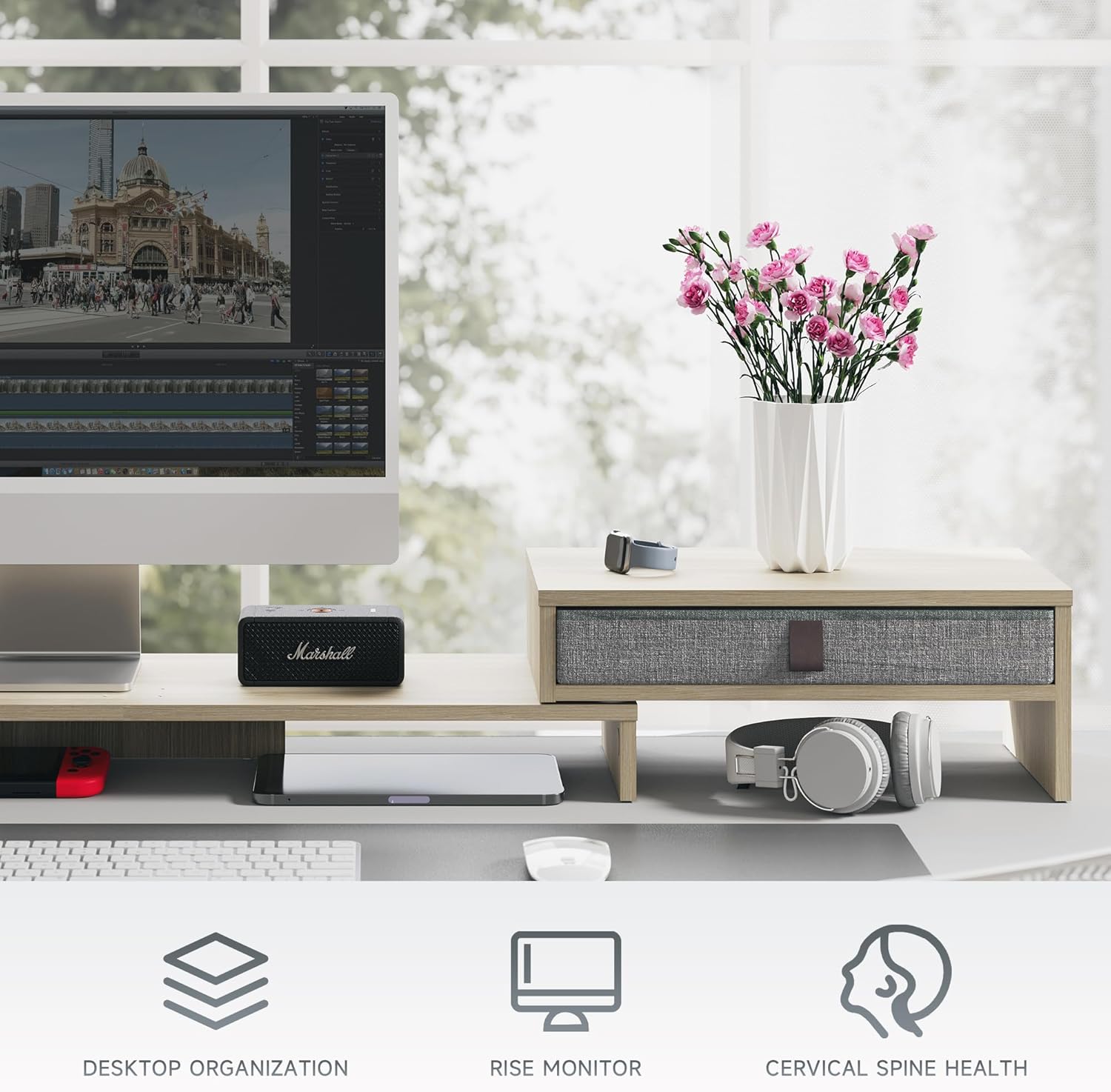 Fenge Computer Monitor Riser Stand with Drawer for 2 or 3 Monitors ,Adjustable Length and Angle Desktop Laptop Stand,Office Organizer,Printer,Oak