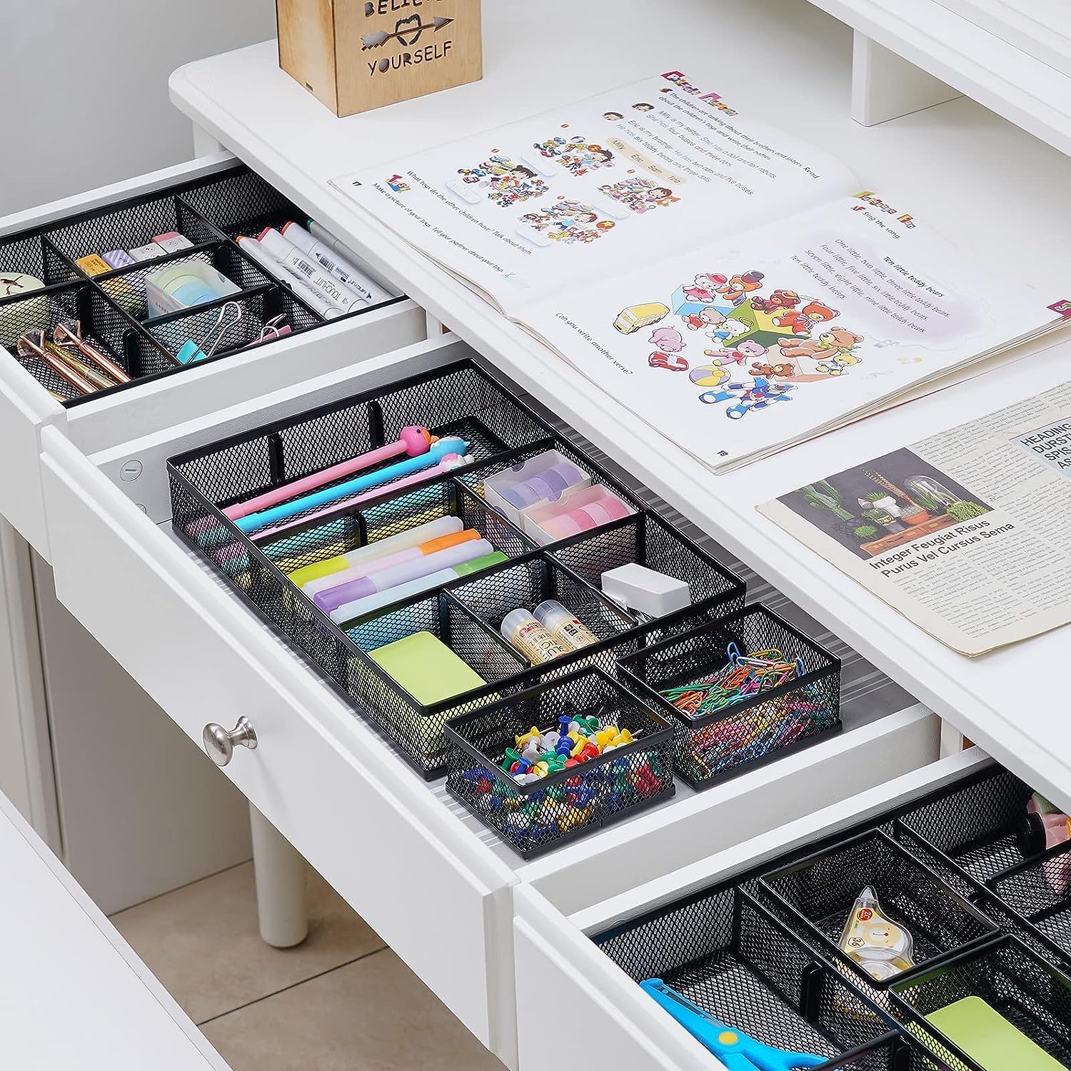 - ăStury and DurableăMade of sturdy black wire mesh structure with powder coated surface, smooth and corrosion-resistant. Non-slip feet can keep the product stable.Big DrawerïŒ12*8.3*2.2inchesïŒ2PC Small DrawersïŒ3.5*3*1.9inches