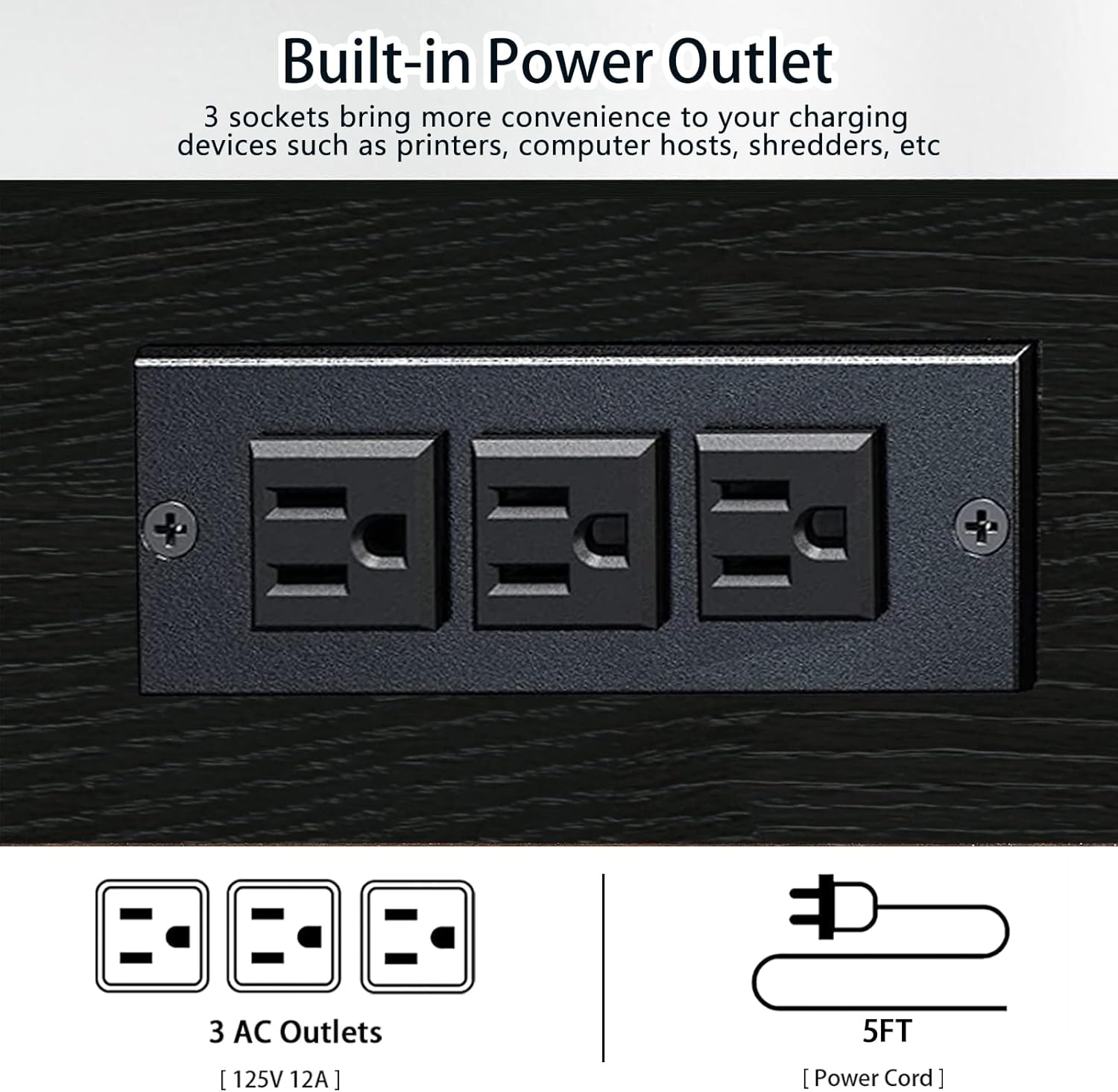 - 【Built-in Power Outlets】The printer table for home office is configured with charging station on the back panel. There are 3 AC outlets, that allows for simultaneous charging of the printer, computer host or shredder, and your laptop. We provide 5ft length power cord for your flexible use of position.
