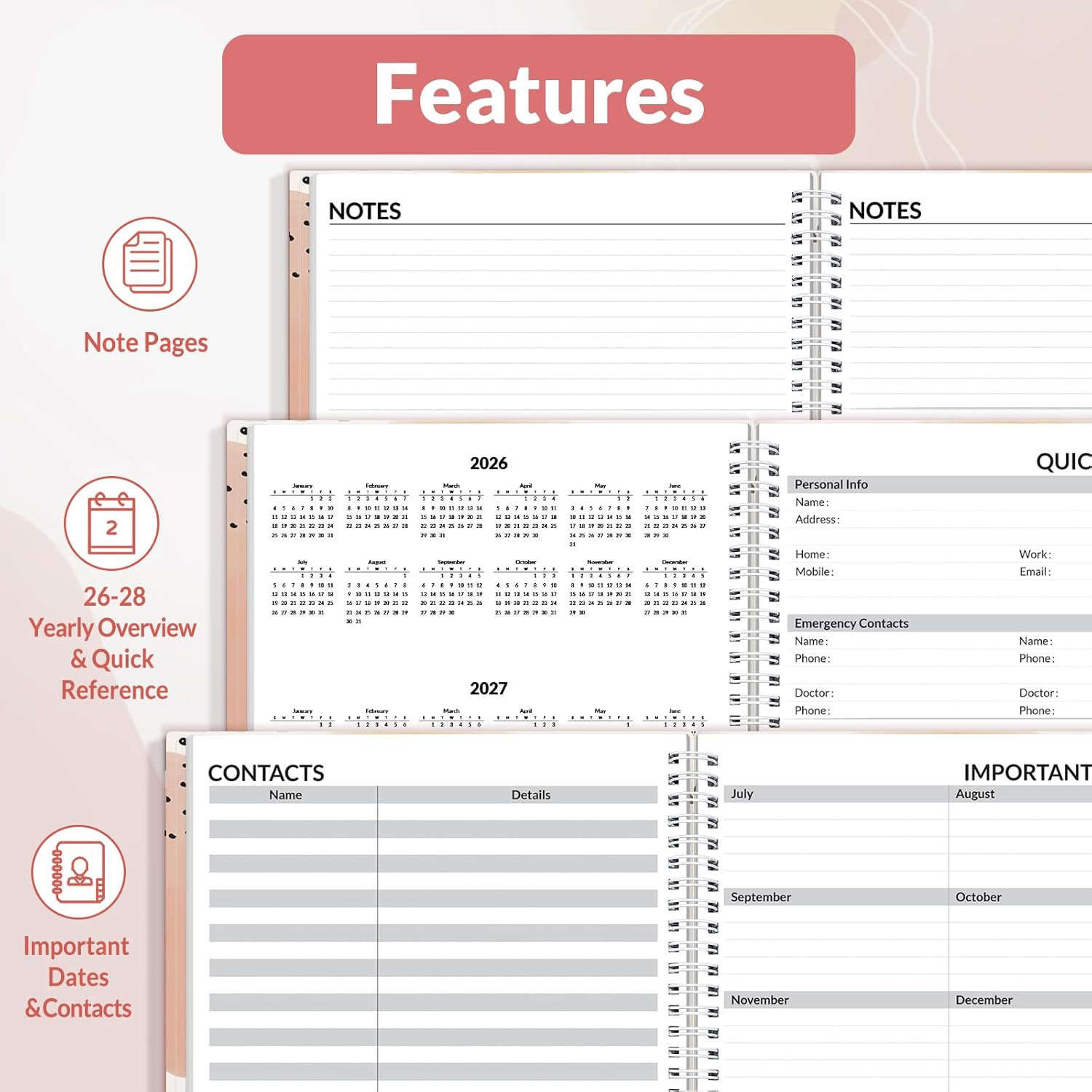 - Additional Features - The weekly planner includes 2026-2028 calendars, year schedule for full year 2026, holiday lists, contact pages, notes pages, important dates, and US time zone map. Rainbow monthly tabs simplify navigation and add a stylish, playful element to the planner's aesthetic.