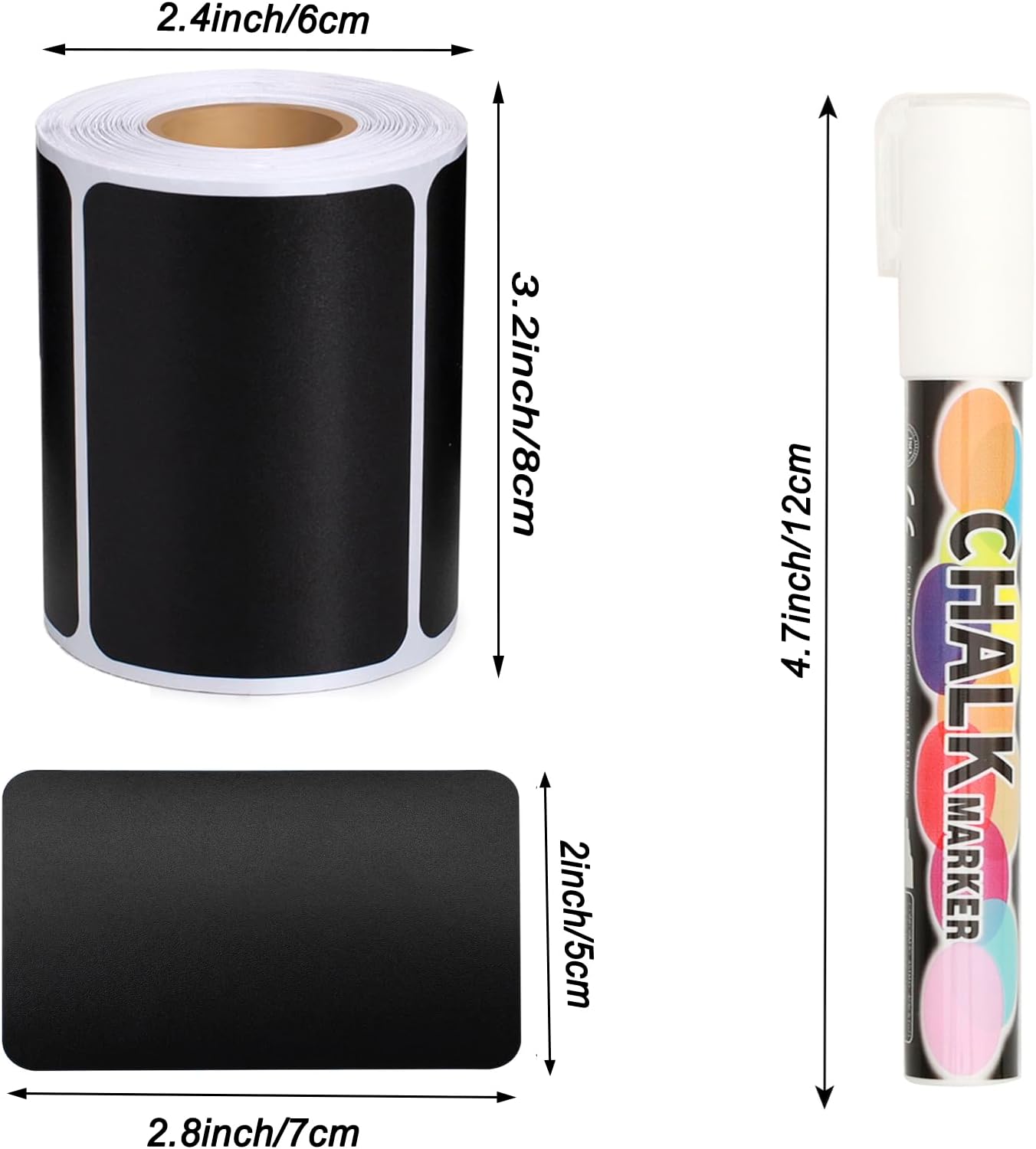 - PACKAGING INCLUDES: A roll of 180 rectangle chalkboard labels 2 x 2.8 inch + 1 Free Erasable White Chalk Marker. Chalk pen with long lasting and quick drying features, safety and non-toxic, no dust, fumes or harsh chemicals; The liquid white chalk marker will keep your records pe will not fade. Brfect and efore: marking with white chalk please shake and then push down the pen point to let the pen tip full with ink, then to writing