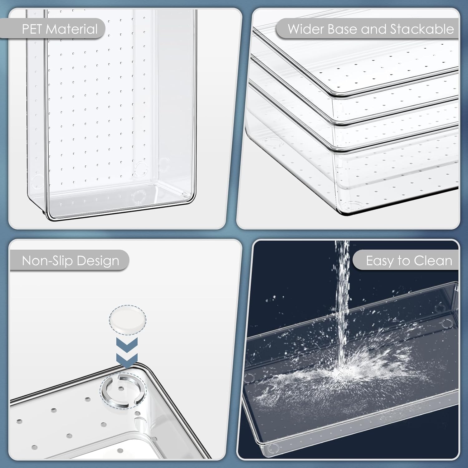 - ăStackable and Non-slip DesignăOur plastic drawer organizers come with enough non-slip silicone pads. They will hold these organizers firmly in place on the drawer or desk. When not in use, these organizers can be stacked together to save your storage space.