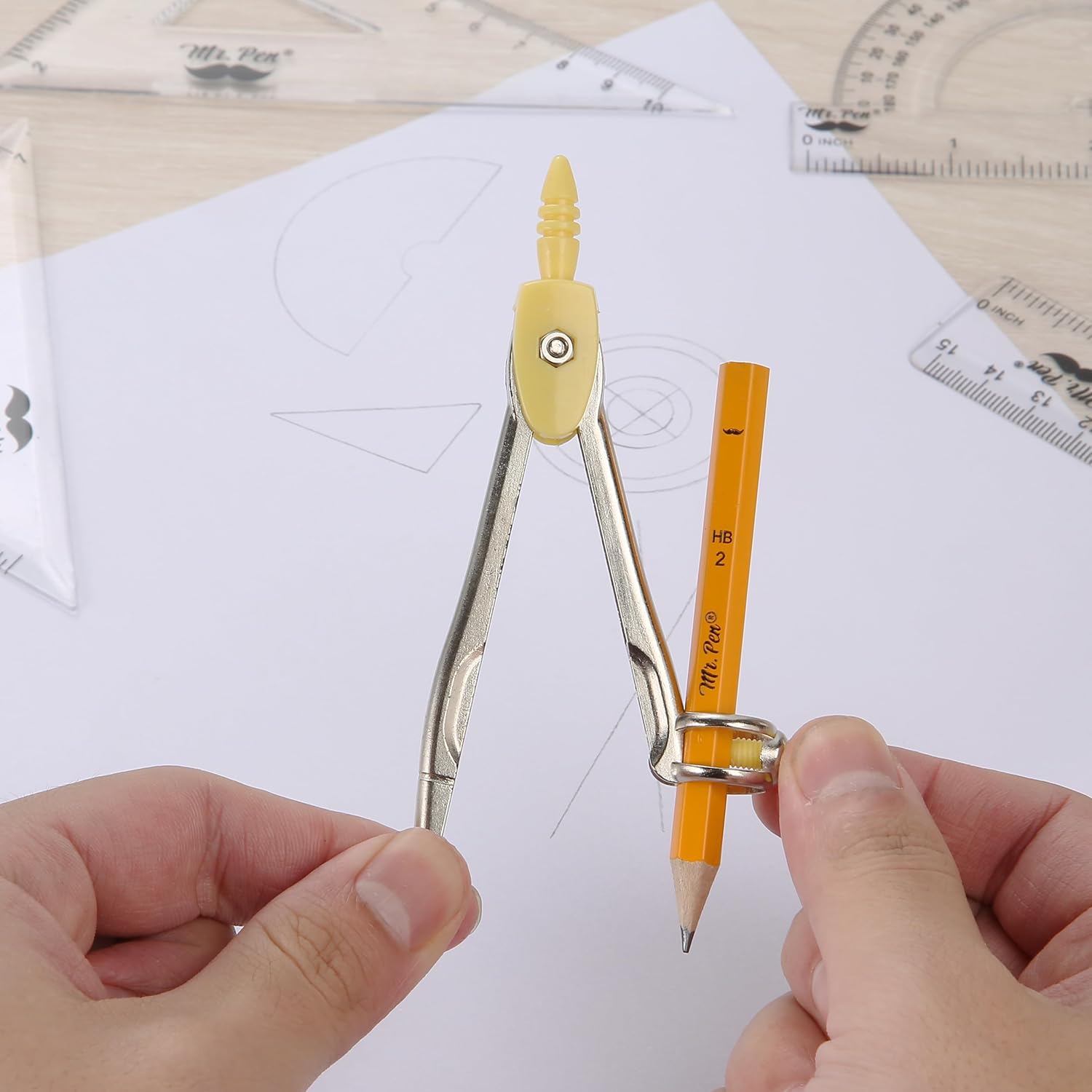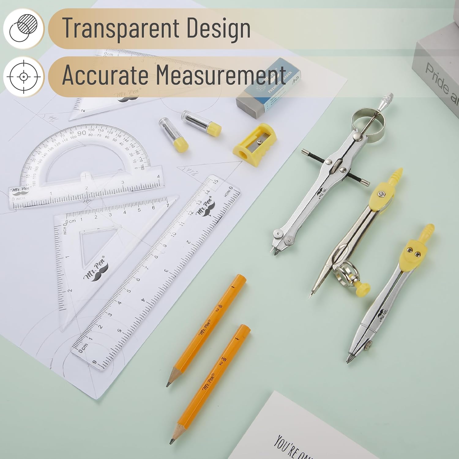 - Mr. Pen geometry set contains 13 pieces, including three metal compasses with spare leads, a 6-inch ruler, two triangles (45° and 30°/60°), a 4-inch protractor, two pencils, a pencil sharpener, an eraser, and lead refills. all encased in a sturdy storage container.