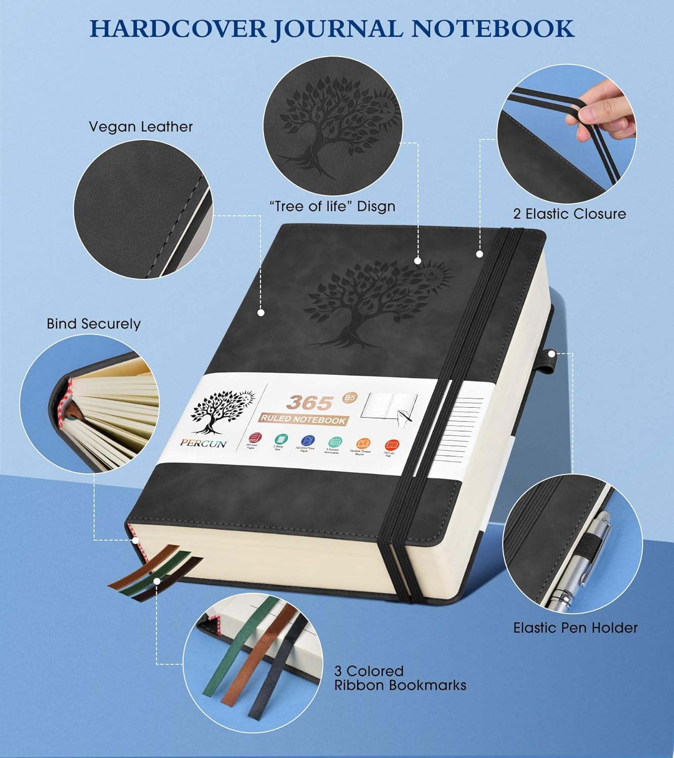 - 【180°Lay Flat for Writing】Our notebook also comes with 180°Lay Flat Journal Notebook, which makes writing a breeze. The elastic pen holder and bookmark ensure that you never lose track of your pen, and the 2 elastic closures ensure that your journal stays securely closed. The 3 colored ribbon bookmarks and 3 sticky labels provide even more ways to customize your journal to your liking.Built-in back pocket that is great for storing loose notes, cards, or other important items.
