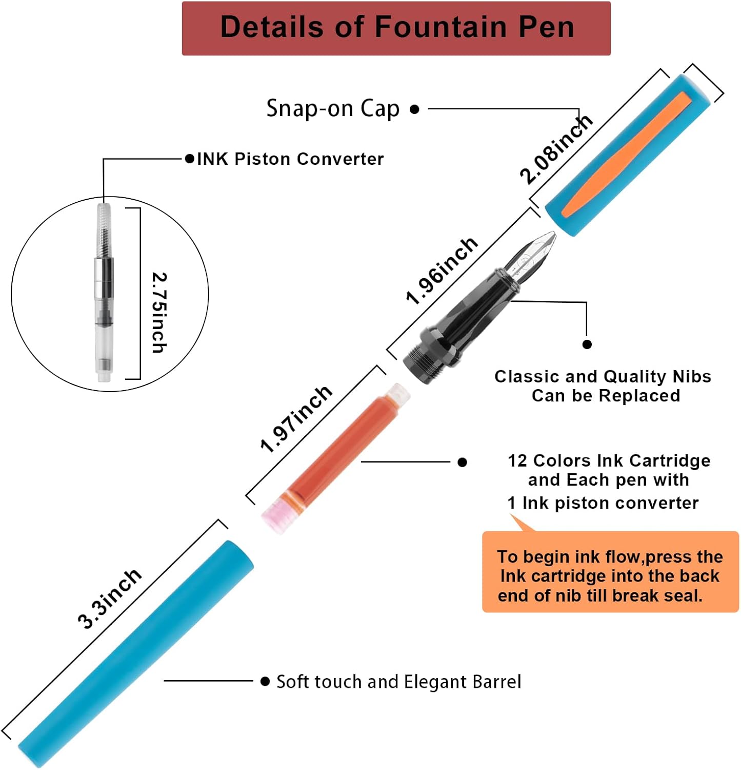 - 【Perfect Gift 】-The fountain pen and ink cartridge set 7 different replaceable nibs fits everyone who loves calligraphy writing,art drawing,especially for the calligraphy beginners,and it's a great gift for Birthday,Christmas,Thanksgiving,you can add it as a gift to your friend,family,or your partner in anytime.