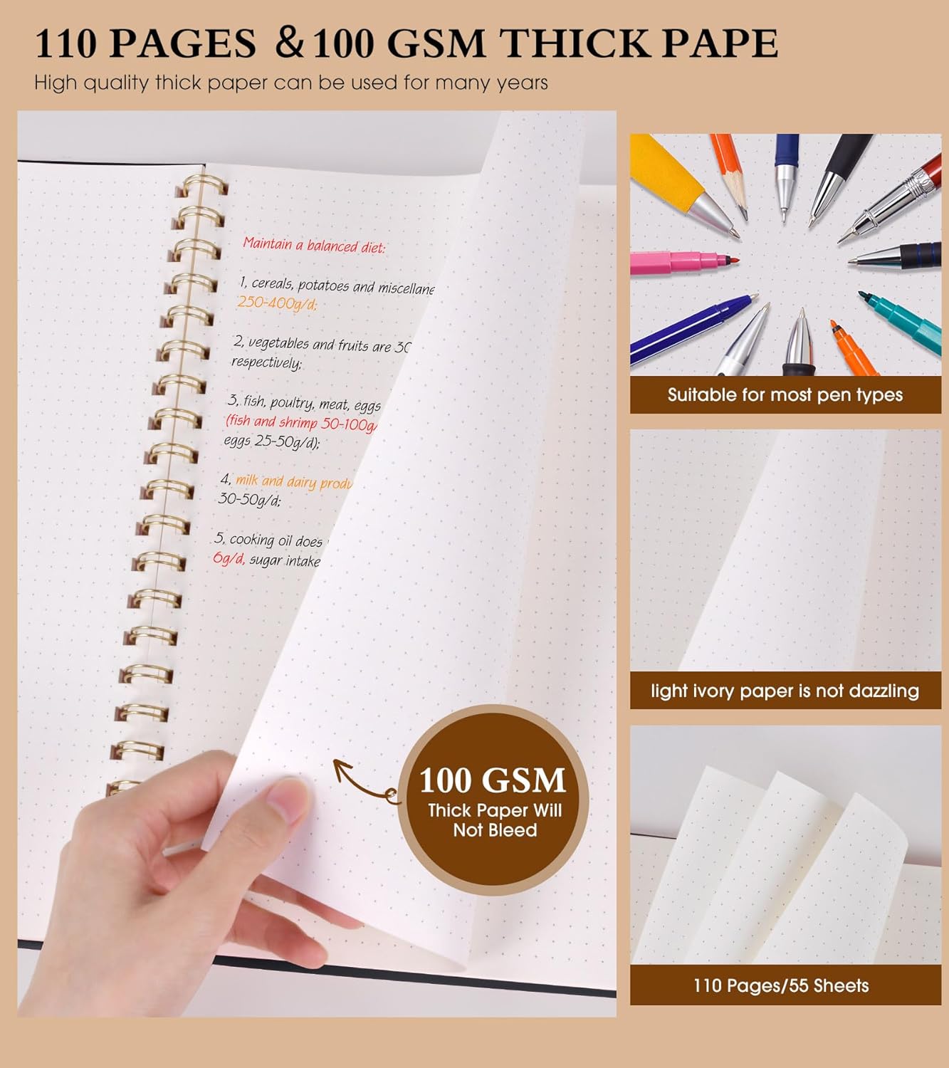 - 【100 GSM Ink-friendly Paper】 Our black spiral dot grid notebook pages are very thick, which avoids ink bleeding through and ghosting. Suitable for most pen types, such as ballpoint pens, fountain pens. Each dotted journal 55 sheets/110 pages, offering enough space to write in. Allowing you to write on both sides of every page to maximize your usable space. light ivory paper is not dazzling, let you have a comfortable writing experience.