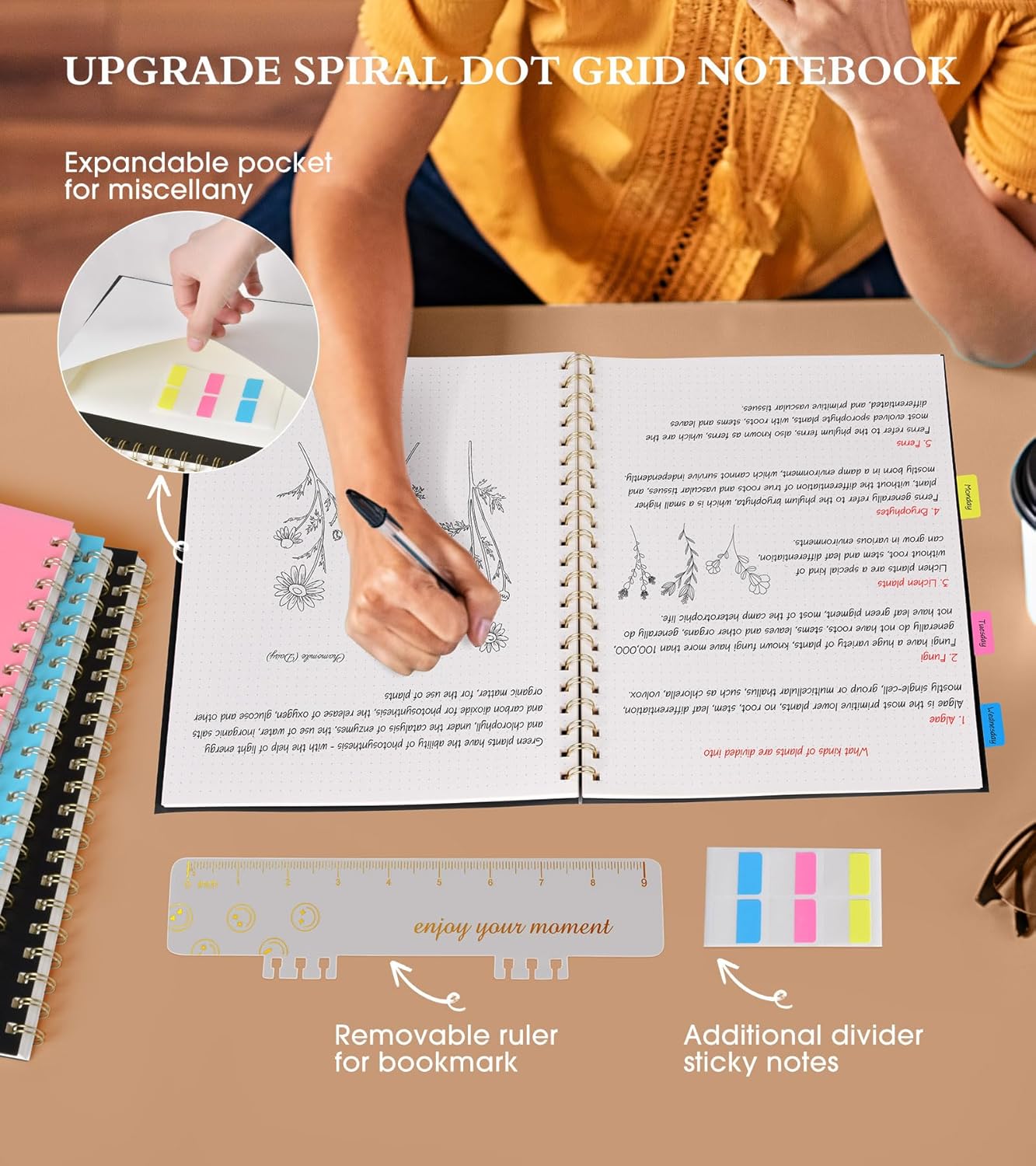 - 【Upgrade Dotted Journal Notebook 】The bullet dotted journal has many upgrade features. Come with an elastic closure band, works as bookmarks. Equipped with a removable ruler can help you measure and chart. Personal information page makes it easy to keep track of queries. The back cover includes an expandable pocket for cards and note-taking notes. 1 gift of multicolor index tabs stickers for classification and reference.
