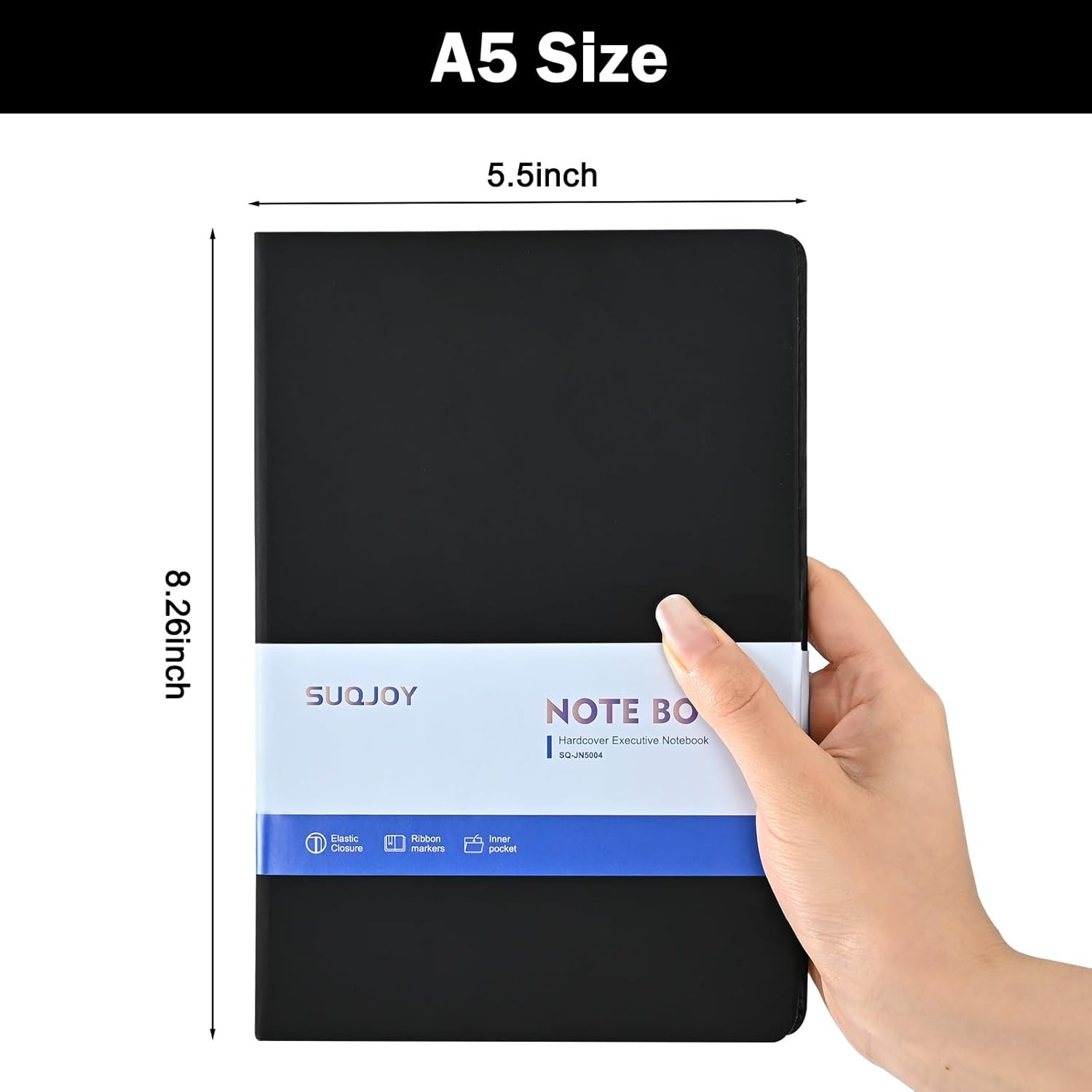 - Classic Hardcover Business Notebook: The notebook size of 5.5 X 8.2-inch, lightweight and portable. Notebook features durable and water-resistant PU leather cover, rounded corners, ribbon bookmark, elastic closure band & inner expandable pocket.