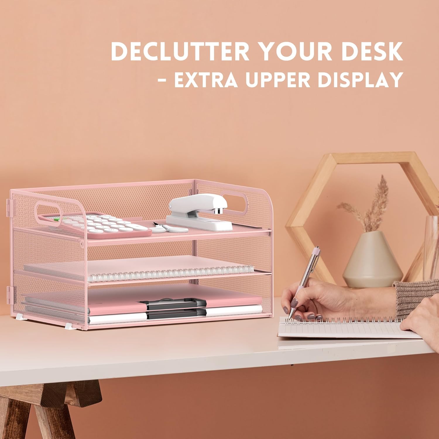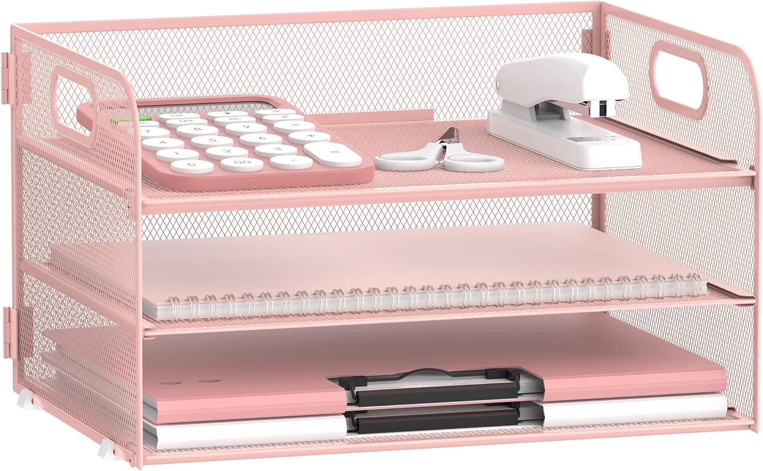 SUPEASY 3 Tier Paper Organizer with Handle, Mesh Desk Organizer Letter Tray, A4 File Folder Paper Tray, Pink