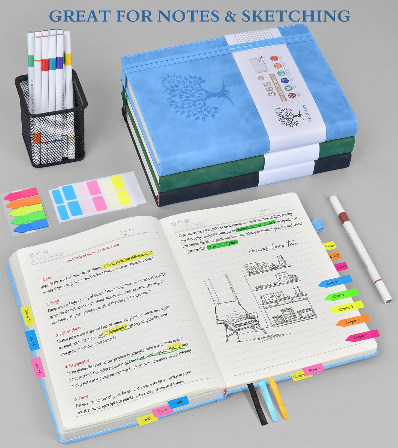 - 【365 Pages Premium Thick Paper】: Our PERCUN lined journal notebook is made of 365 pages high-quality 100Gsm thick ruled pager with an acid-free light Ivory paper that is thicker than normal. This premium quality paper will not cause bleeding, ghosting or smudging and is suitable for most types of pens,provides ample space for journaling, note-taking, and creative writing. The line spacing is 7mm, making it easy to write legibly and neatly.