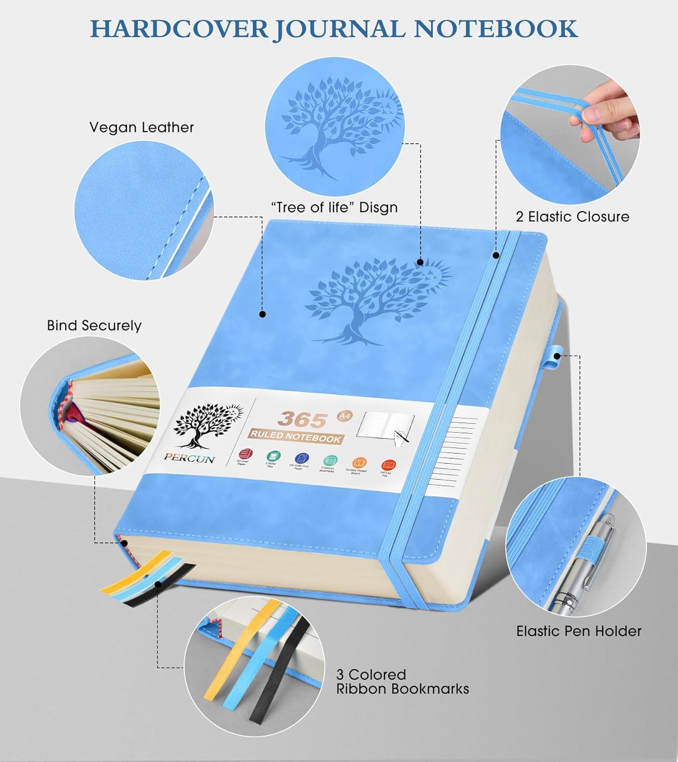- 【180°Lay Flat for Writing】Our notebook also comes with 180°Lay Flat Journal Notebook, which makes writing a breeze. The elastic pen holder and bookmark ensure that you never lose track of your pen, and the 2 elastic closures ensure that your journal stays securely closed. The 3 colored ribbon bookmarks and 3 sticky labels provide even more ways to customize your journal to your liking.Built-in back pocket that is great for storing loose notes, cards, or other important items.