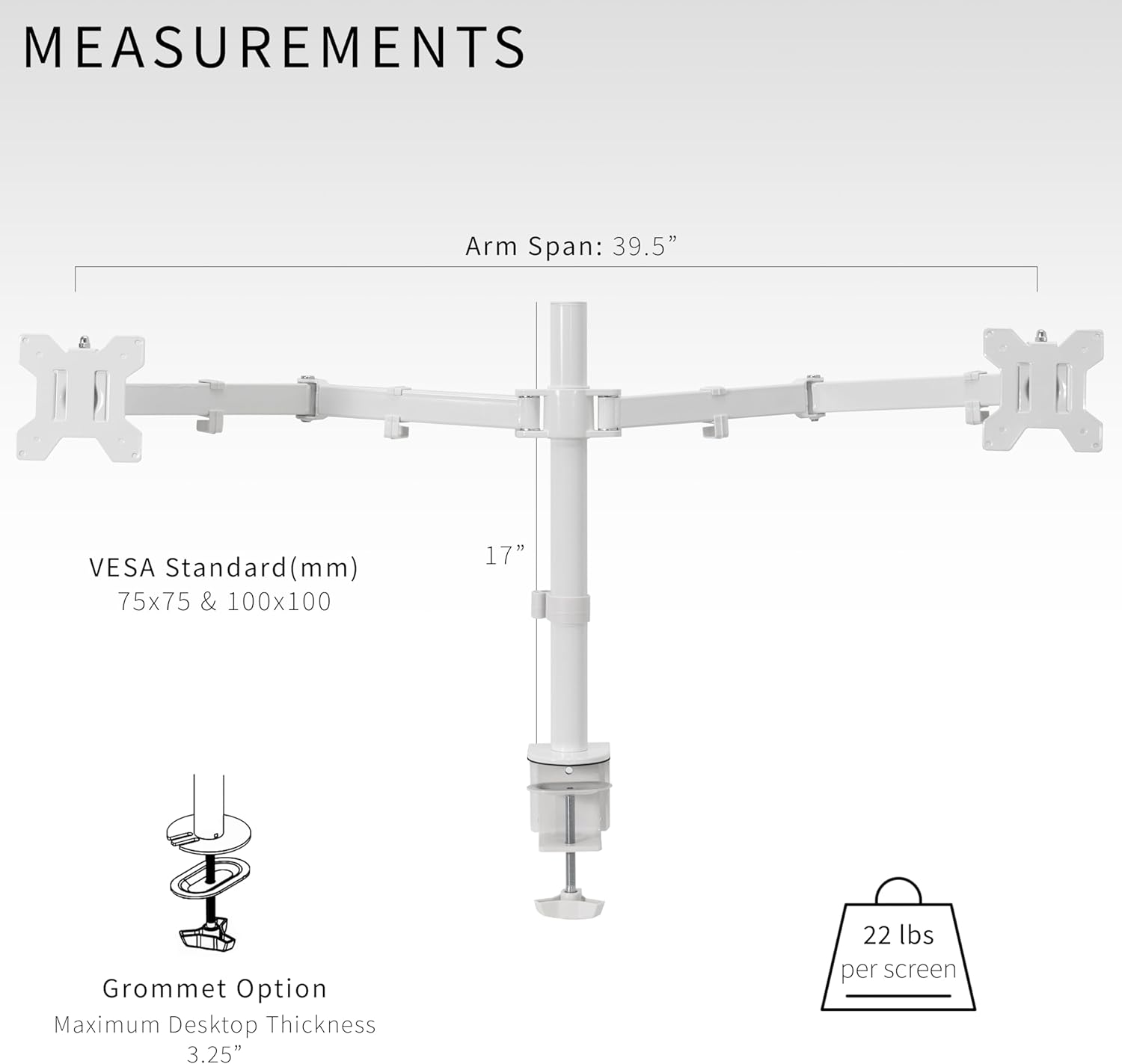 - Ultrawide Compatibility: Dual ultra-wide monitor mount fitting two screens up to 38” in size and 22 lbs in weight each with VESA 75x75mm or 100x100mm backside mounting holes