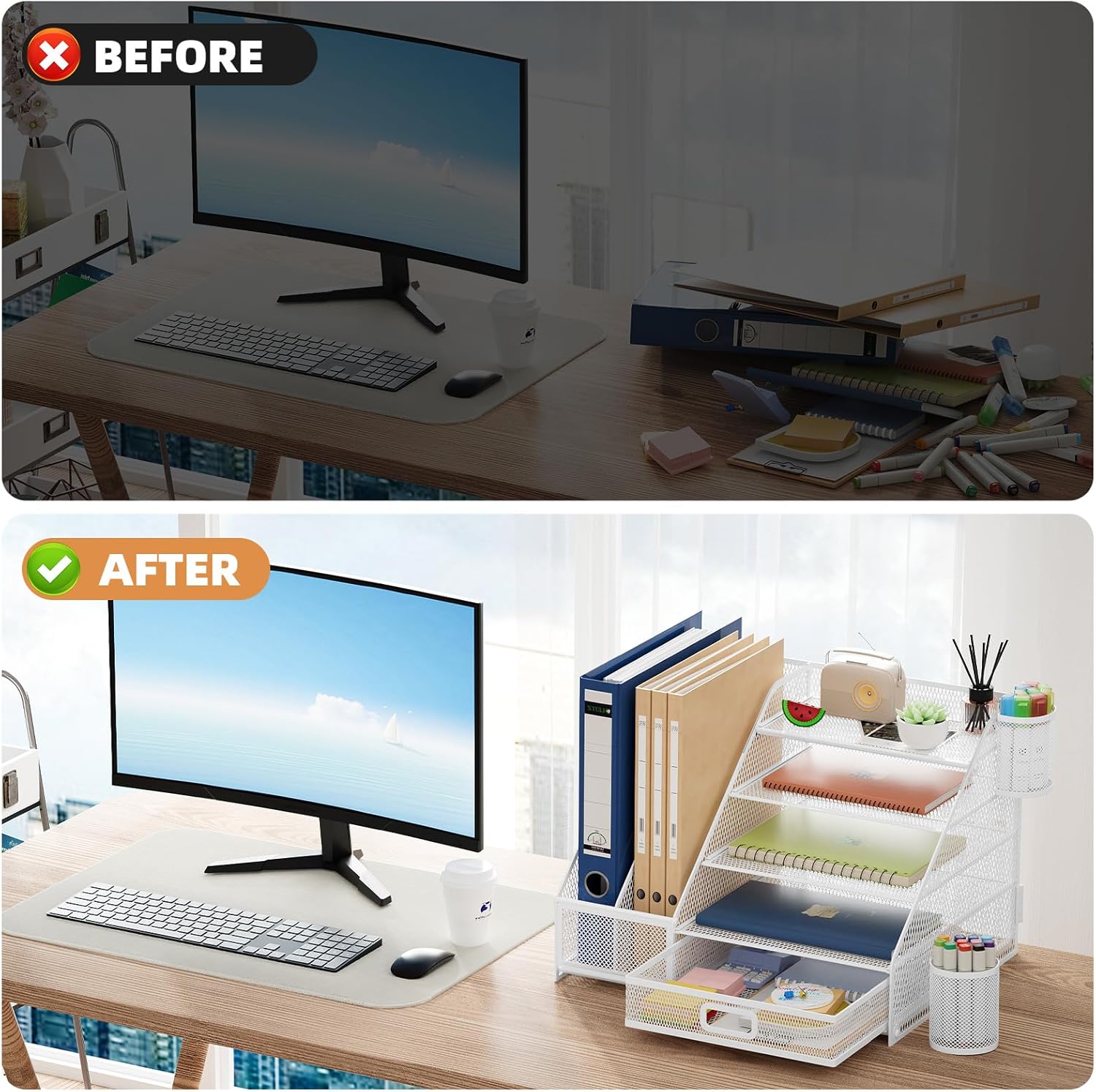 - 📂【Large Capacity】The desk organizer maximizes both the storage area and your desk's available space. For your notebooks, magazines, letters, and A4 paper, the ladder paper tray organizer would provide ample space. If you have documents and folders to store, consider using the vertical file holder to keep your office documents in order. The drawer organizer and hanging pen holder are enough to accommodate all office supply accessories and so on. Perfect Size:14.4*11*12inch.