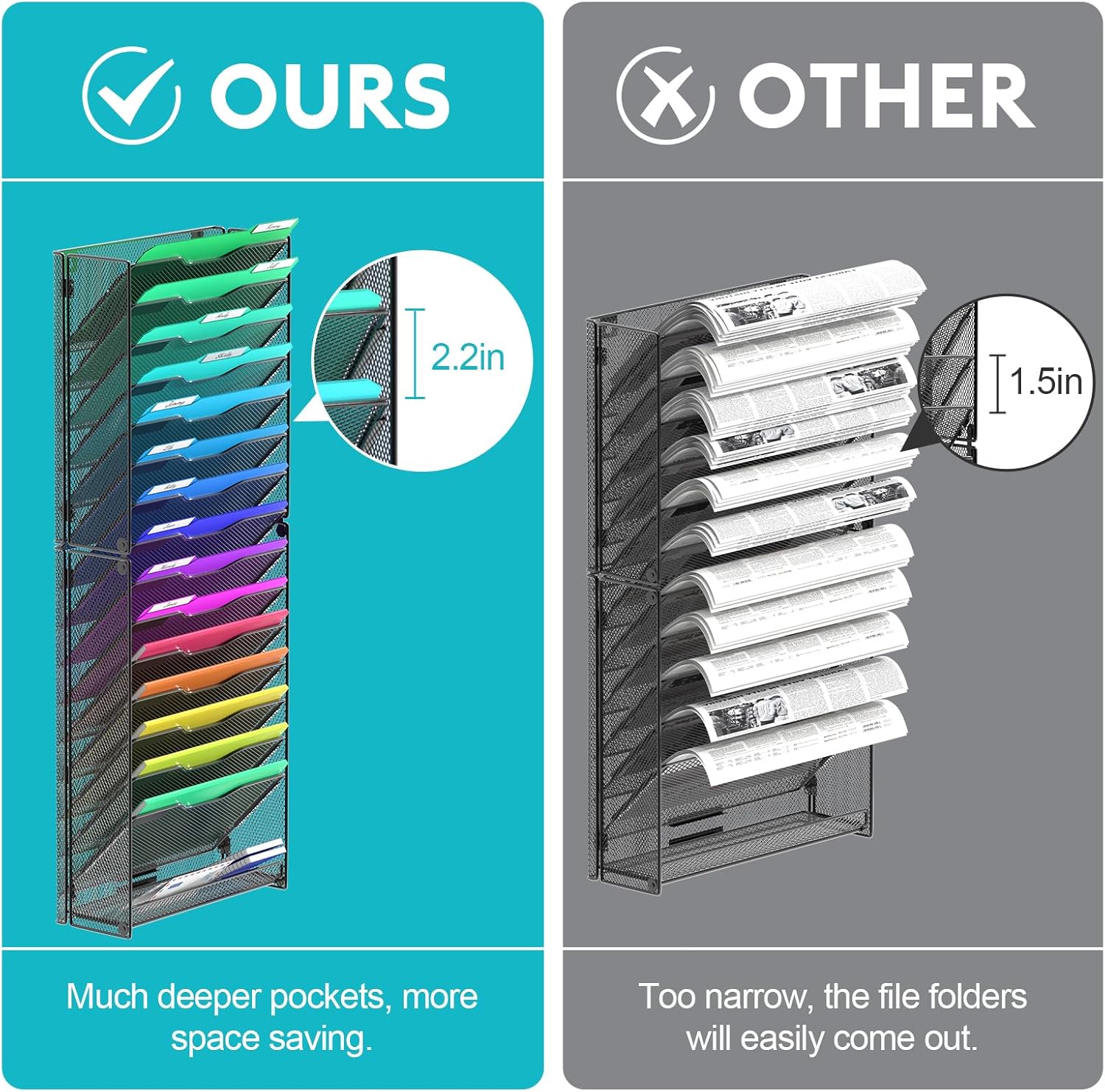 - Much Deeper and Wider Pocket: The depth is about 7.5 inch,which is quite deeper than similar products. Otherwise, the file folders will easily stick out.