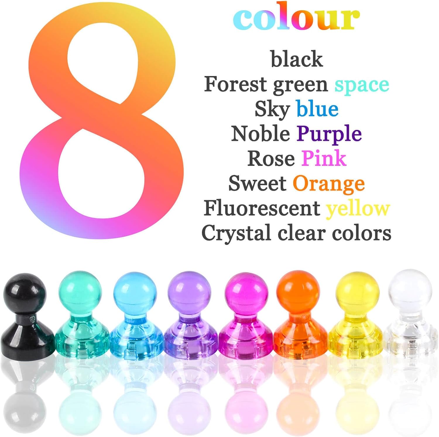 - Colorful Push Pin Magnets: Set of 112 push pin magnets, including 8 different bright colors: crystal clear, fluorescent yellow, rosy pink, grass green, sky blue, noble purple, sweet orange, crystal black