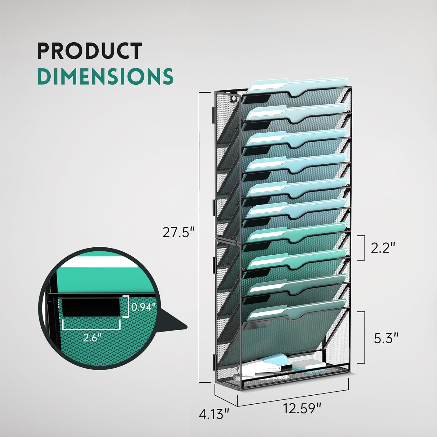 - Easy Installation: Simplify your life with our 11 tier wall file organizer! Installation is a breeze, requiring only a few screws. Quick, simple, and efficient - you'll be amazed at how easily you can transform your space. Upgrade your storage today with our sleek and sturdy wall document organizer design.