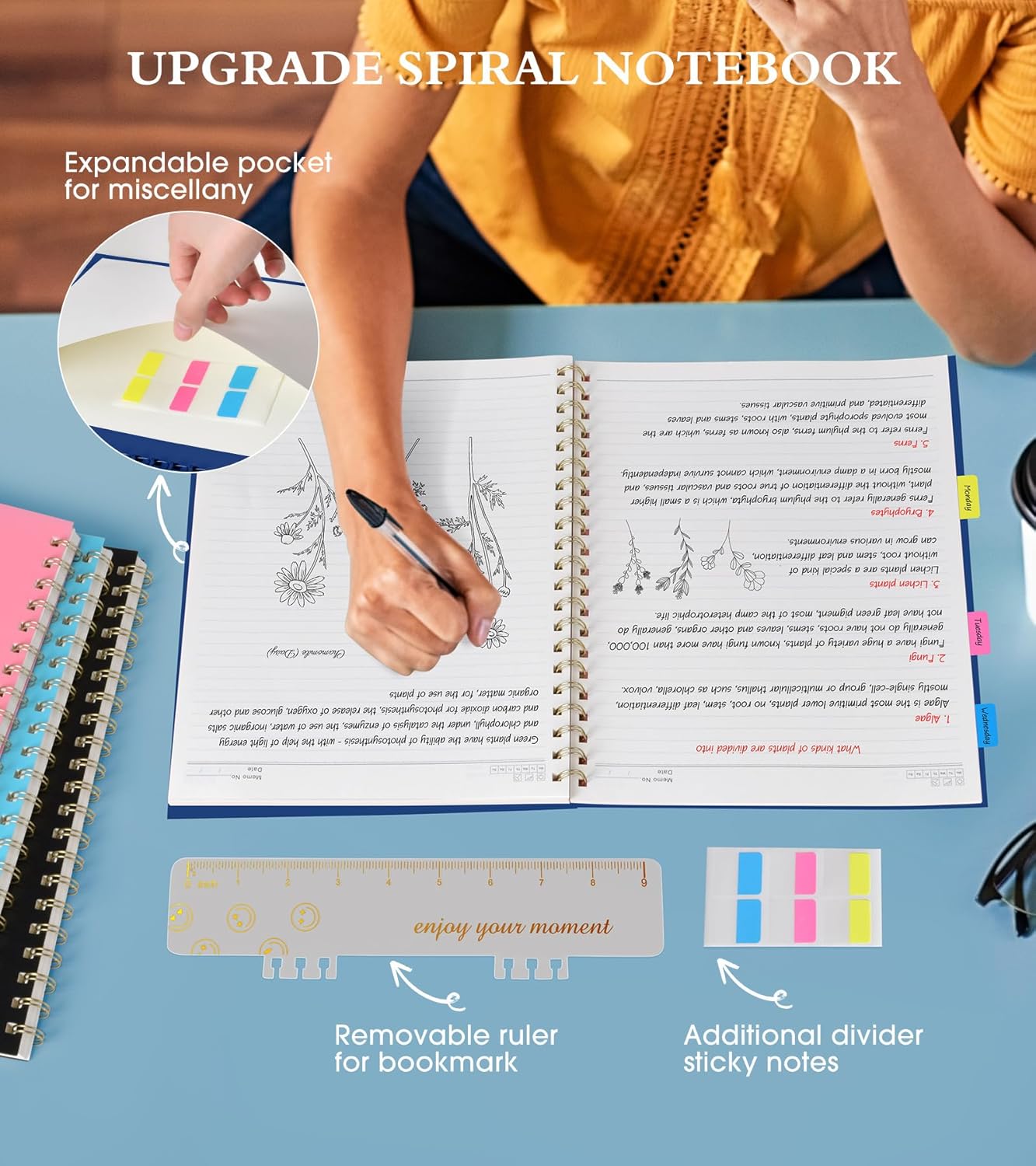 - 【Strong Spiral Metal Twin-Wire】 Our spiral journal notebook has a sturdy gold-color double wire spiral with easy-to-turn pages and keeps pages attached reliably, while still staying flat when opened, which reading more convenient and taking notes more efficient. Spiral bound journal easy to tear-off and fold over, as well as flip the cover back, giving you a better writing experience. Golden spiral bound adds aesthetic matching, it’s the perfect big notebook for journaling, and planning.