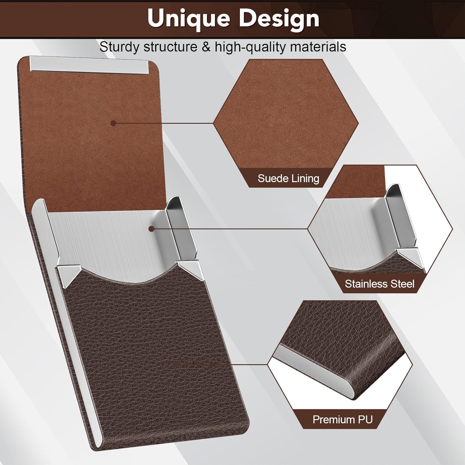 - Material: Our business card holder made of luxury PU leather and high quality Stainless Steel. It has a good solid construction, use longer.