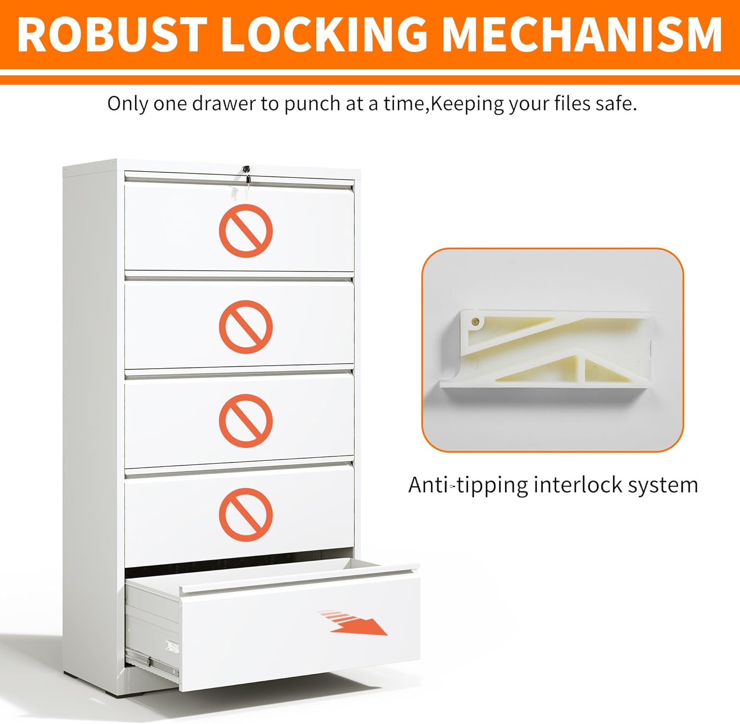 - 【High Security】This office file cabinet ensures high security with 1 interlock and 2 keys, a single lock effectively secures all drawers, allowing you to store valuable documents without any worries. Additionally, the Anti-tilt Mechanism design ensures that only one drawer can be opened at a time, preventing tipping and providing an extra layer of security for your important files.