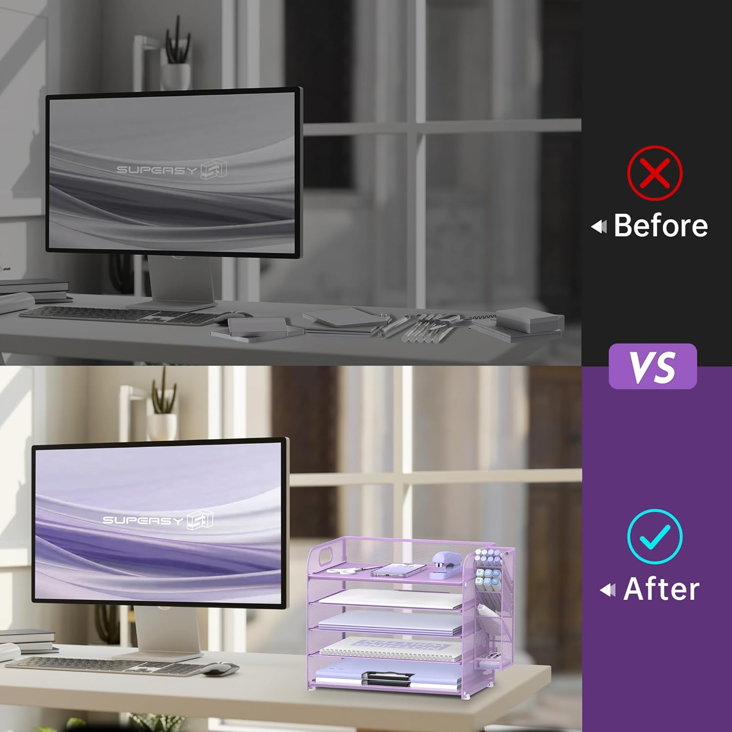 - [5 Tier Large Capacity] Upgraded SUPEASY purple desk organizer is 4+1 tier paper tray organizer. This paper organizer has 4 detachable trays which is perfect for holding letters, A4 paper, books, bills, magazines, mails, folders, notebooks and so on. The desk organizers can fully take advantage of your vertical space and keep your desktop clear and tidy.