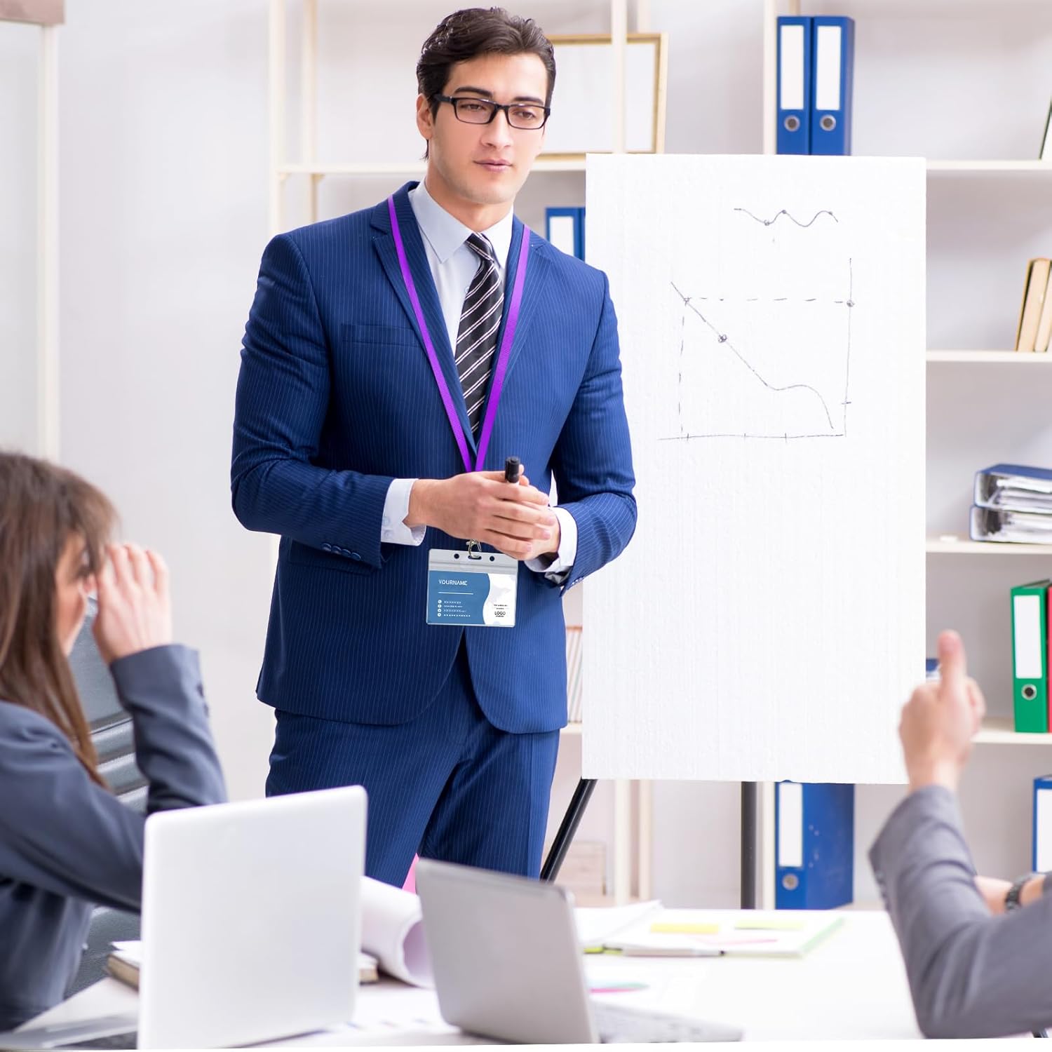 100 Pack Lanyards for ID Badges with Clear Name Tags, Reusable Lanyards Horizontal ID Card Badge Holders Plastic Name Badges for Men Women Kids Business School and Office Supplies (Purple)