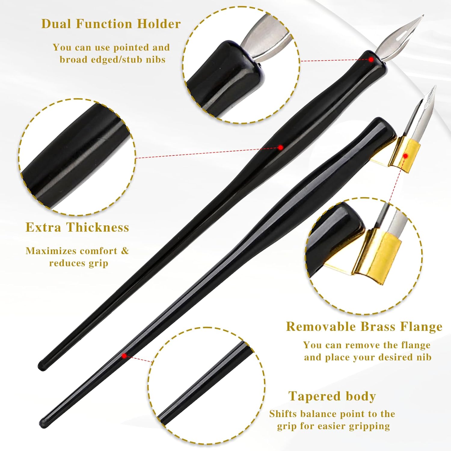 - High-Quality Material: The oblique calligraphy pen holder is made of high-quality plastic black rod, which provides a comfortable grip; the pen tip is made of thin stainless steel, which can be used for a long time, is not easy to rust, and writes smoothly. It also features a small curved shaped dip in the front of the holder for your index finger to rest on