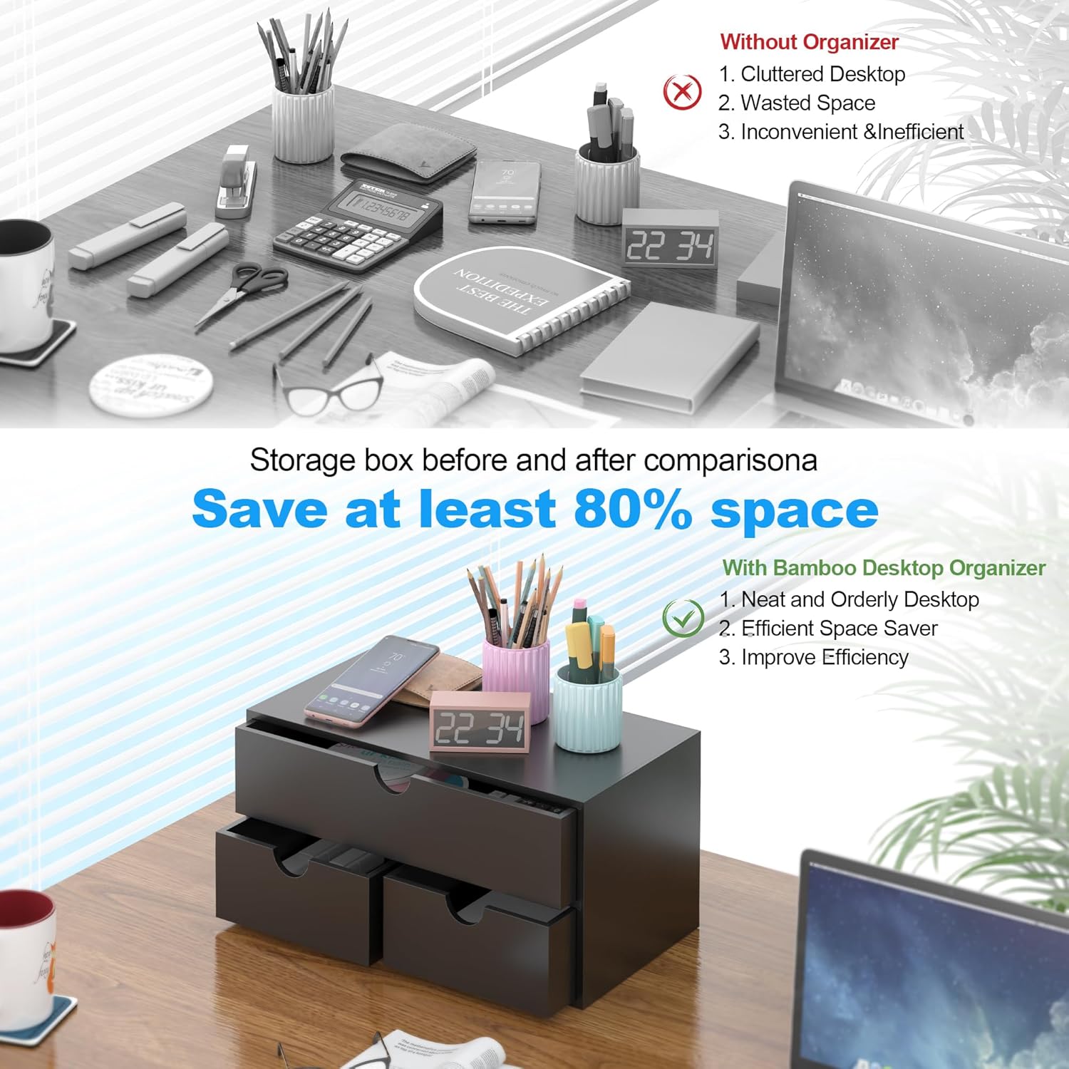 - Eco-friendly Bamboo Material: The desktop storage is made of 100% natural bamboo, providing an elegant solution for storing mail and various desk accessories. The stackable design allows for tidy organization, making your life easier.