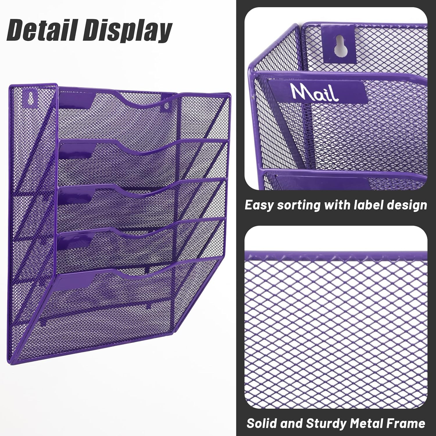 EASEPRES 5 Pocket Mesh Hanging Wall File Organizer, Wall Mounted Mail Paper Document Folder Holder, Clipboard Storage Organization Magazine Rack with Nametag Label for Office Home School, Purple