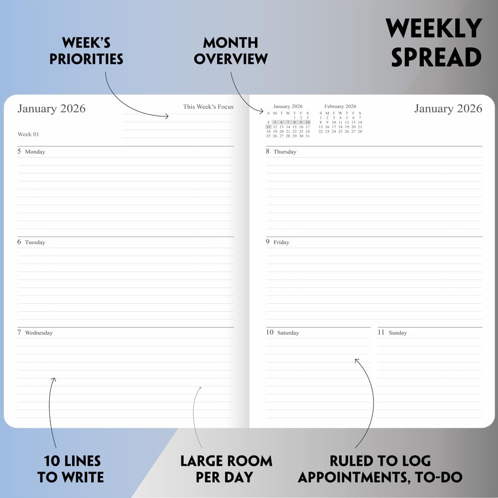 - Dated 2025-2026 planner with monthly and weekly pages for year-round planning, Oct 2025 to Dec 2026