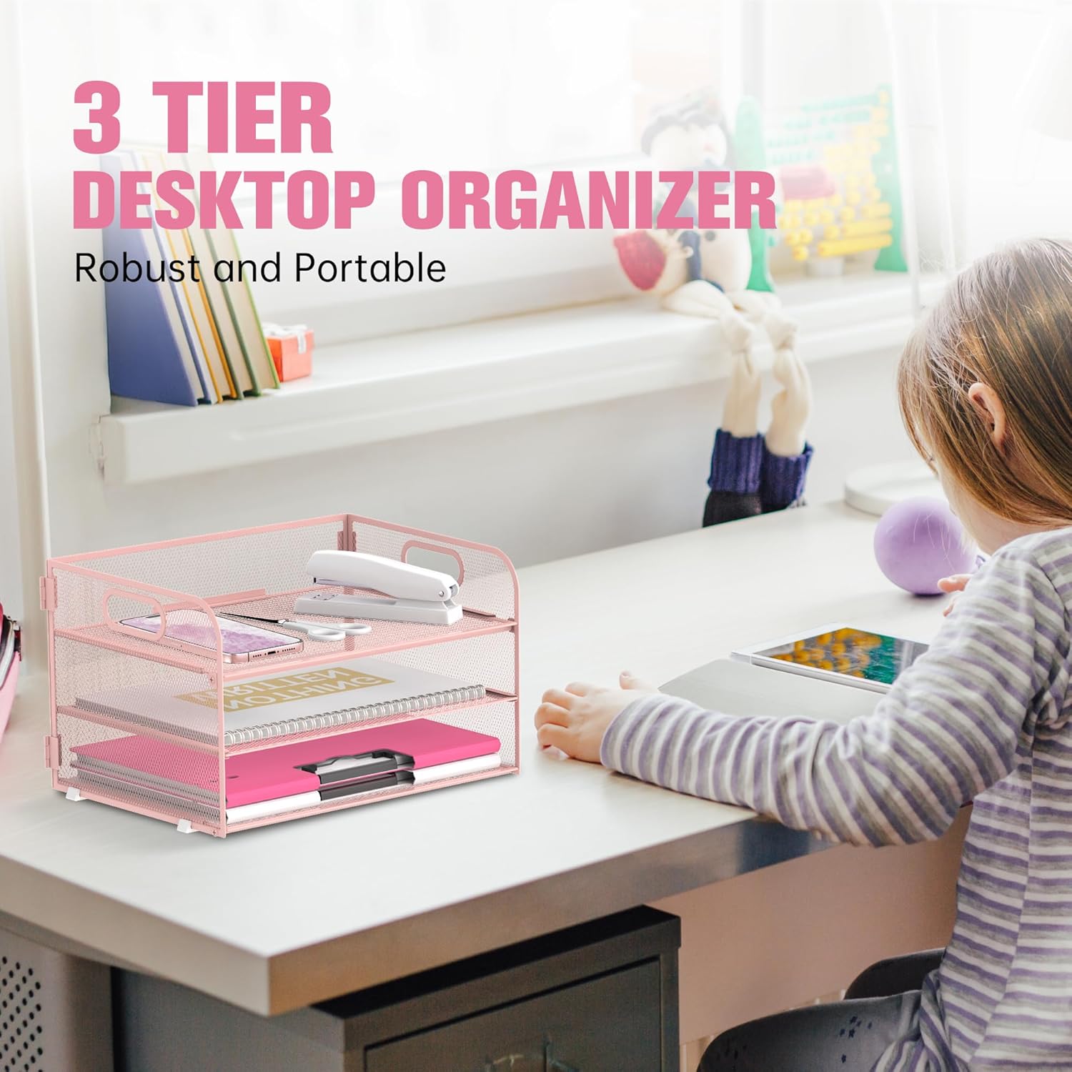 Daltack 3-Tier Paper Organizer with Handle, Mesh Desk Organizer Letter Tray, Paper Tray Organizer File Organizer for A4 File Folder, Pink