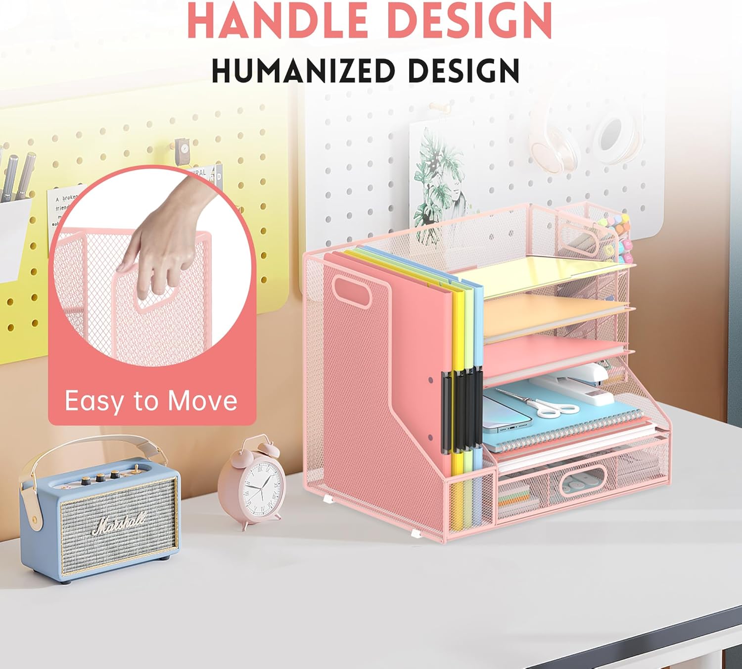 DALTACK Mesh Desk Organizer, 5-Tier Paper Letter Tray with File Holder & Pen Holder & Sliding Drawer, Desktop Organizer and Storage for Desk Accessories Office Supplies, Pink