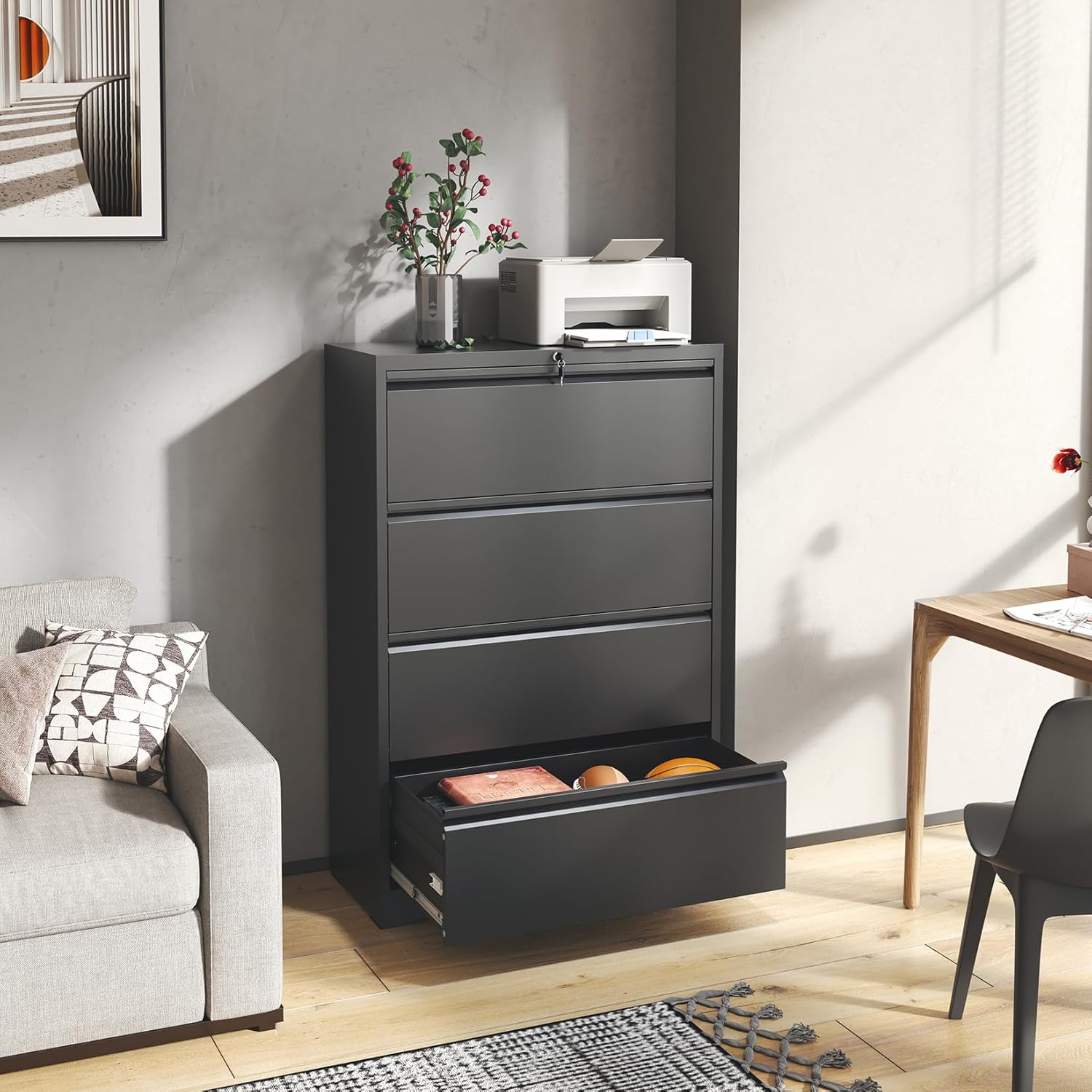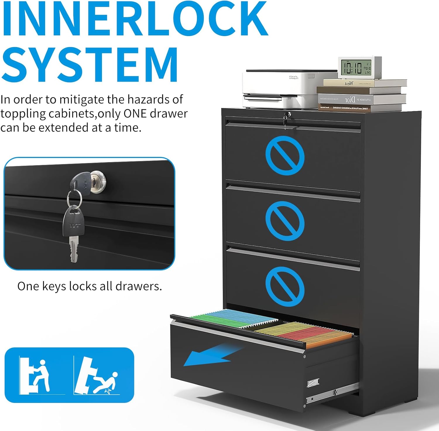4 Drawer Lateral File Cabinet with Lock, Metal Lateral Filing Cabinet for Home Office, Steel Wide Horizontal Filing Cabinets for Letter/Legal/A4/F4 Hanging Files (Black)