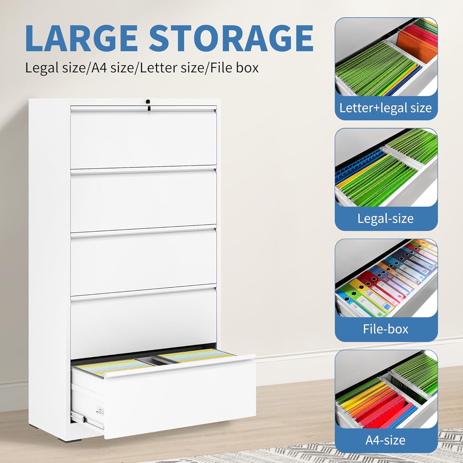 File Cabinets 5 Drawer,Metal Office Storage Filing Cabinet with Lock,White Lateral Filing Cabinet for Home Office,Horizontal Locking File Cabinets for Legal/Letter/A4,Assembly Require,White