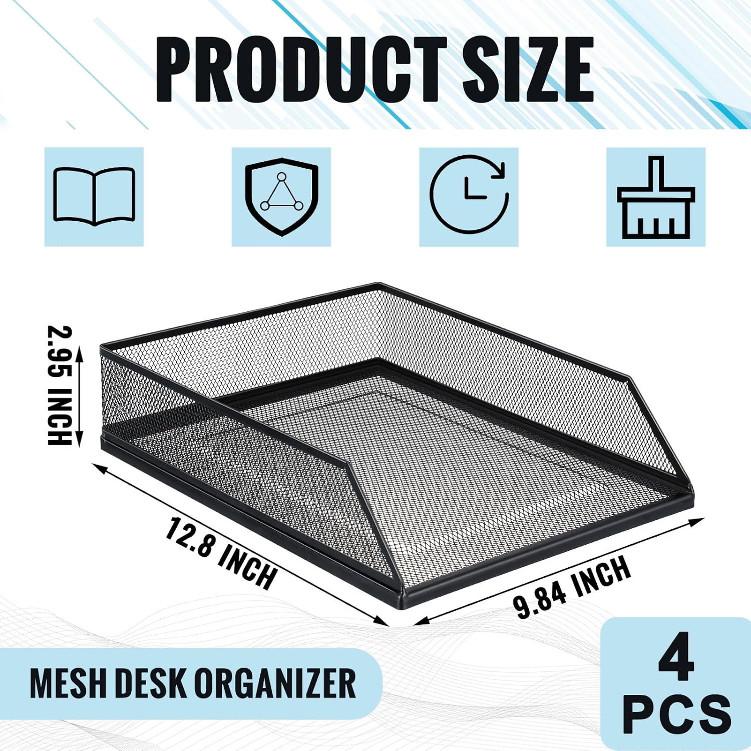 Hicarer 4 Pcs Black Metal Letter Tray Stackable Desk Tray Single Wire Mesh Organizer Front Load File Paper Holder for Desktop Office Home School Classroom (12.8 x 9.84 Inch)