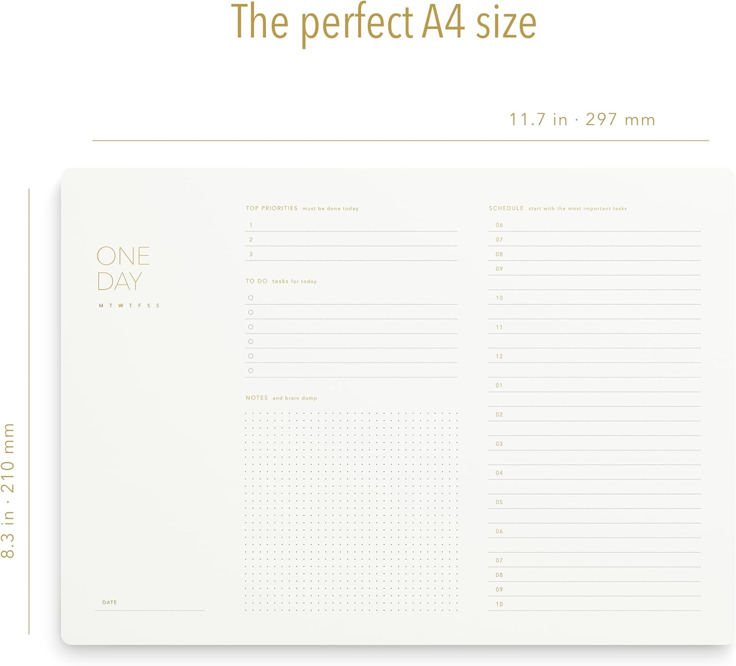 One Day, Elegant Daily Desk Planner, Gold Foiled, Minimalist Productivity Planner Pad, Time Blocking Hourly Schedule, To Do List Notepad, A4, 52 Pages, FSC™ Certified