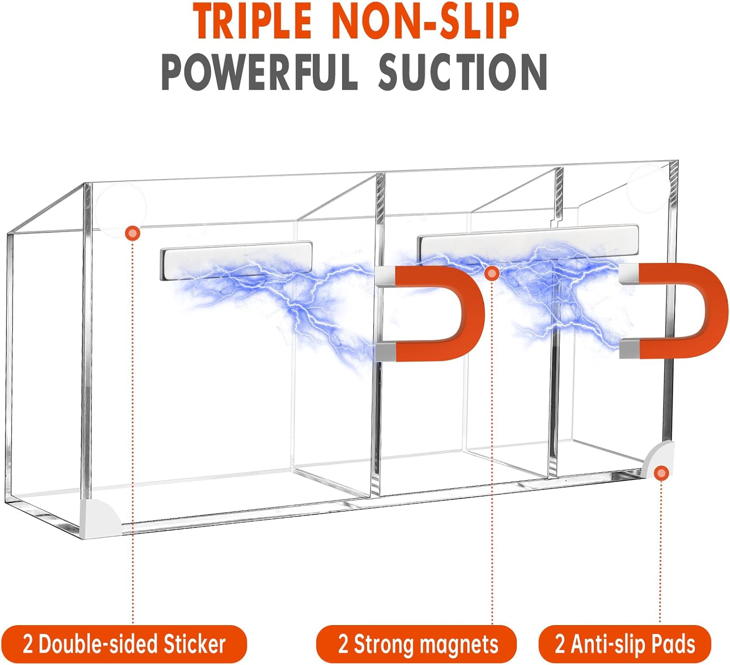 - 【TRIPLE ANTI-SLIP FUNCTION】The acrylic pen holder features magnets, non-slip pads and double-sided stickers, it ensures that it is securely fastened to magnetic surfaces such as refrigerators, whiteboards, or lockers and does not slide easily.