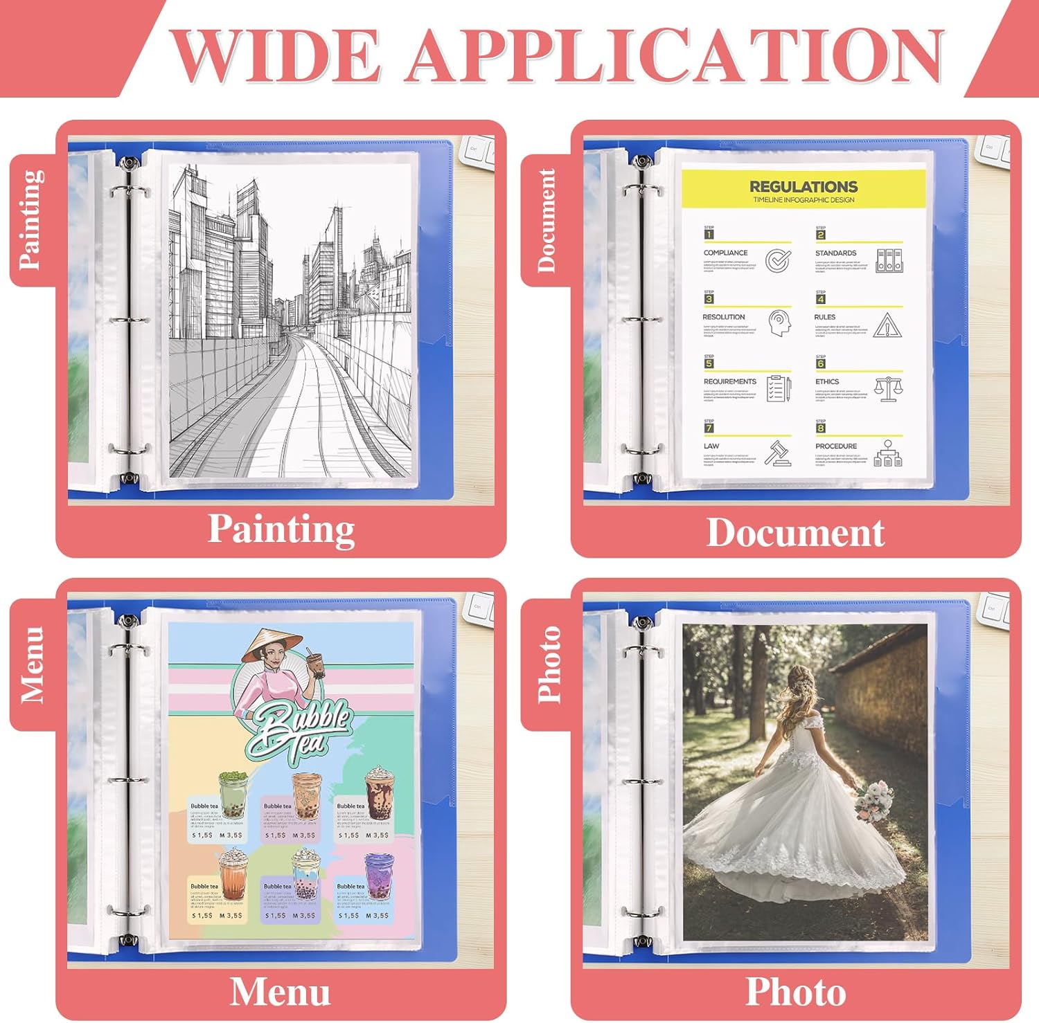 - Easy to Use:Wide top loading binder sleeve opening makes it easy to keep documents, copy paper, photo paper, records, recipes, references, business documents and photos inside the protective sleeve