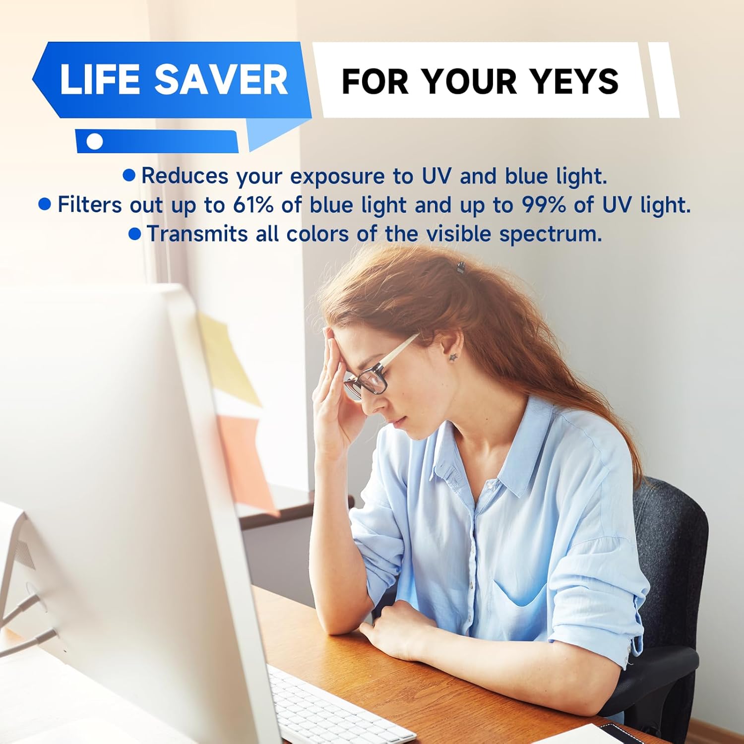 - 【ANTI BLUE LIGHT AND GLARE】Our computer screen blue light blocker filters out up to 68% of blue light and up to 99% of UV rays in the 380~460nm range, helping to reduce eye fatigue and related discomfort. It also has an anti-glare function that prevents digital eyestrain and headaches. Whether it is children elderly or pregnant women, students, suitable for most other people.