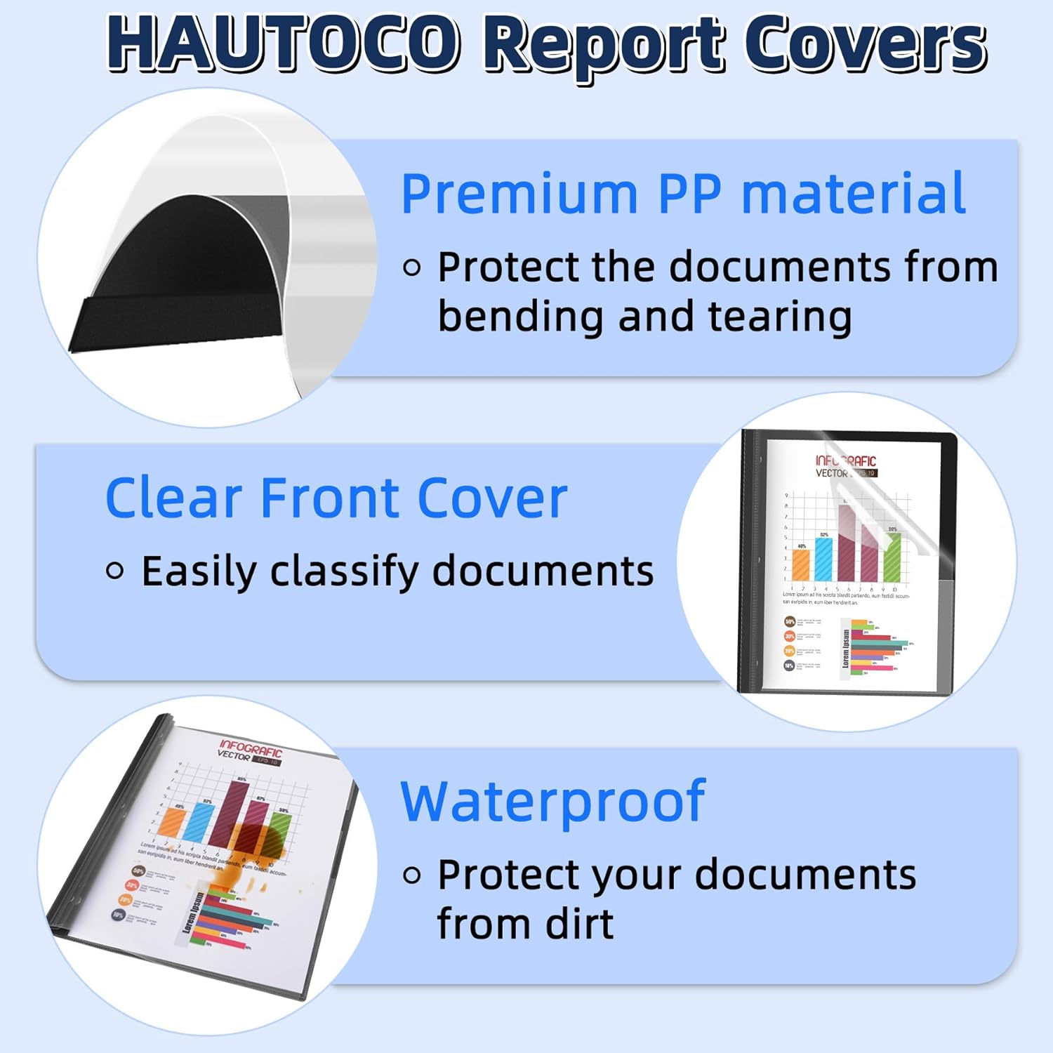 HAUTOCO 30 Pack Plastic Report Covers with 3-Prong Fasteners Clear Front Presentation Folders Resume Folders for 8.5x11 Letter Size Paper, Document Report Cover for School Office Business, Black