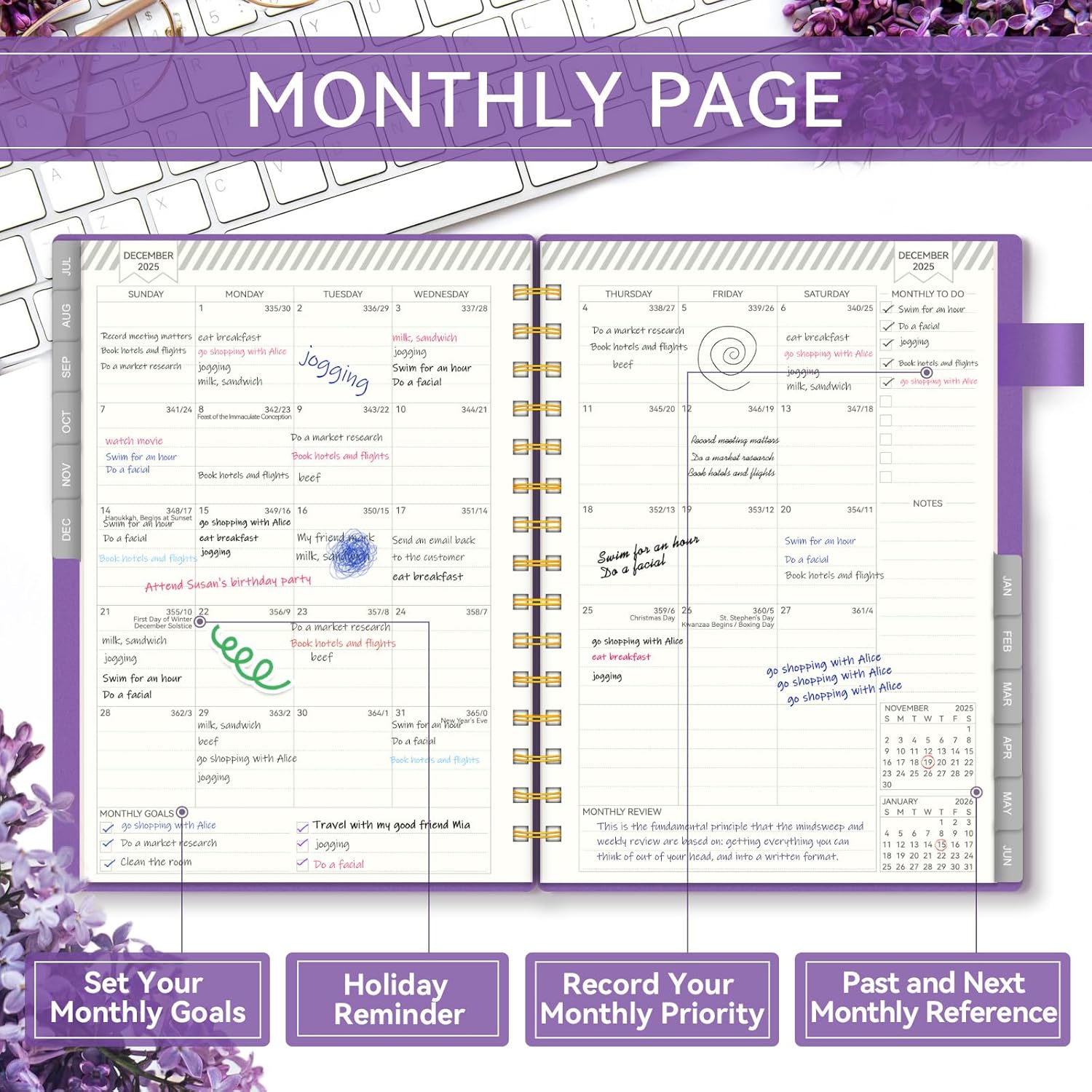 - 📒Clear Monthly Overview: Our planner 2025-2026 contains 12 months of monthly pages, ready with monthly tabs for quick reference. Richer content contains monthly goals, to do list, reviews, major holidays listed, elapsed and remaining days noted. Keep track of important deadlines, special events and more of every month with clear organization.