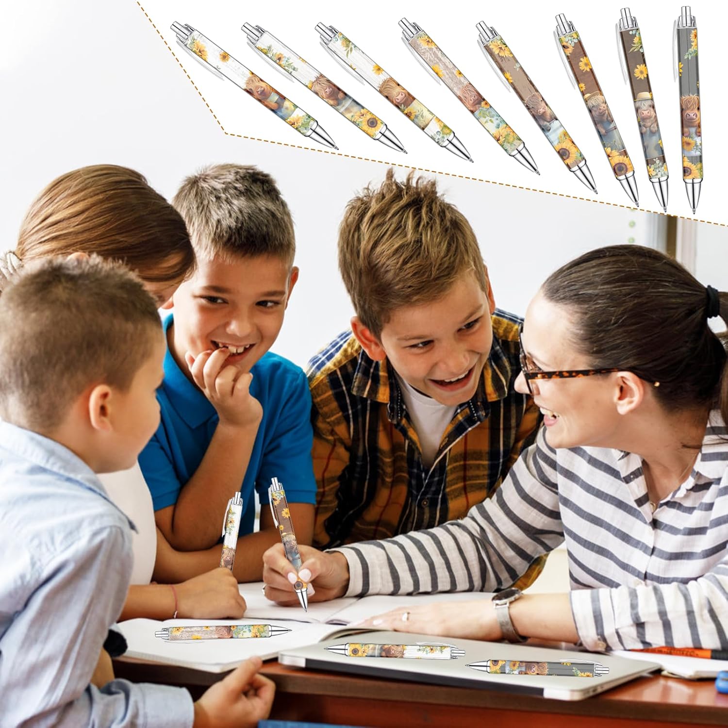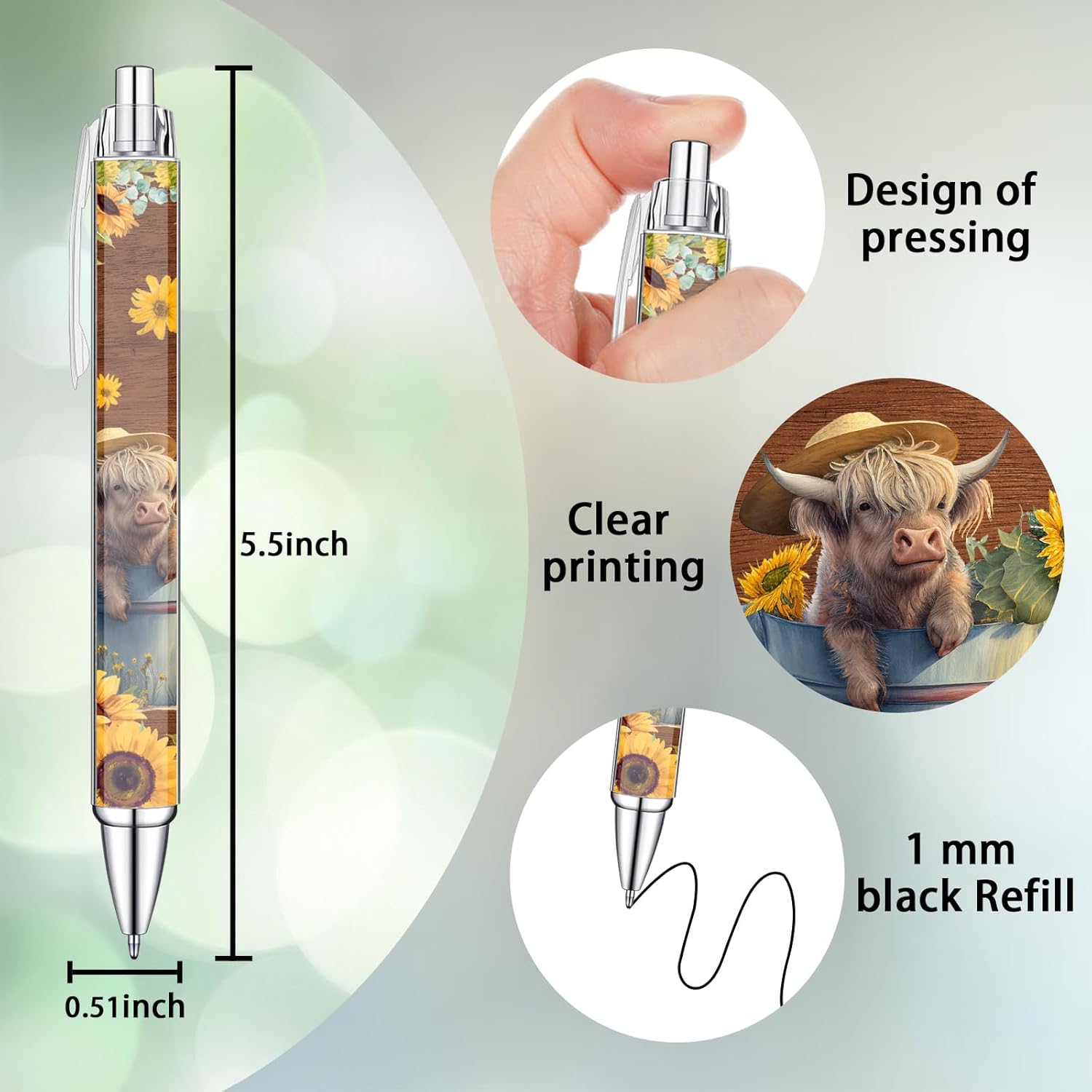 - Highland Cow and Sunflower Designs: Our Highland Cow Pens feature a delightful array of whimsical designs, each showcasing the iconic Highland cow and sunflowers. Adorned with charming illustrations, these pens infuse your writing experience with rustic elegance and artistic flair.